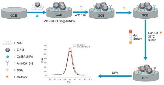 The GCE was first polished with 0.3 um and 0.05 um alumina slurry on chamois leather until a mirror-like surface was obtained. The electrode was then ultrasonically cleaned nitric acid (50% v/v) for 5 min successively, pure ethanol and distilled water. After cleaning, the electrode was electrochemically activated in 3% H2SO4 by potential cycling: dissolution/deposition at 2.0 V, for 60 s, followed by 0.9 V for 30 s, and “cyclic voltammetry” (CV) scanning from −0.9 V to 1.1 V at a scan rate of 100 mV/s. After that, 3 µL of the ZIF-8/rGO dispersion (2 mg/mL) was drop cast on the GCE surface and dried below 39 °C. Then, CS@AuNPs solution (5 µL) was applied on the electrode surface (ES) and dried at 39 °C to form a stable film. Then 5 µL of CA15-3 antibody solution (50 µg/mL) was applied to the ES and incubated at 4 °C for the entire night. In order to block the nonspecific binding sites, the electrode was incubated in 1% (v/v) BSA solution for 30 min at 25 °C, and then rinsed with PBS and dried at 37 °C. After each modification and drying step, the electrode was rinsed with PBS to eradicate the unbound material.