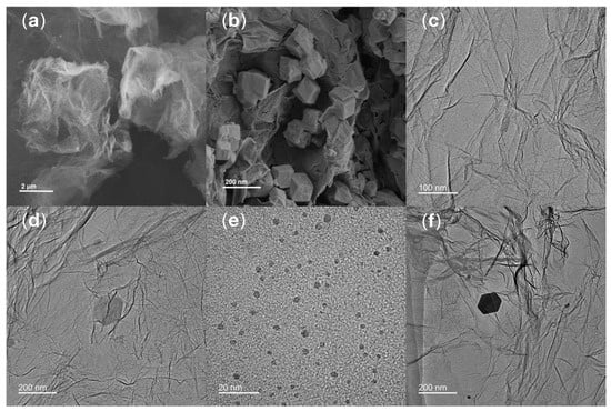 SEM and TEM images of the materials: (a) SEM of rGO; (b) SEM of ZIF-8/rGO; (c) TEM of rGO; (d) TEM of ZIF-8/rGO; (e) TEM of CS@AuNPs; (f) TEM of CS@AuNPs/ZIF-8/rGO.