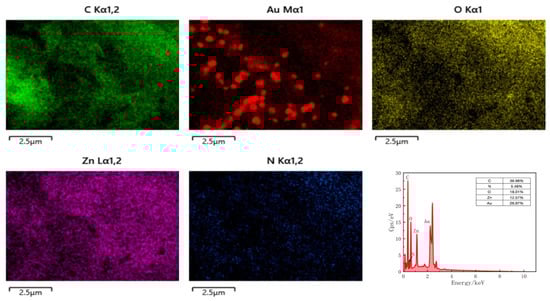 In addition, to verify the successful fabrication of the composite, the elemental distribution of the CS@AuNPs/ZIF-8/rGO material was characterized by EDS (Figure 4). The figure indicates the morphology of the CS@AuNPs/ZIF-8/rGO composite and elemental mapping of C, N, O, Zn, and Au, respectively.