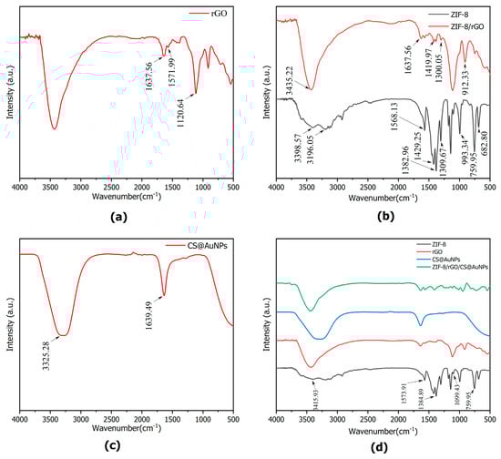 FT-IR images of the materials: (a) rGO; (b) ZIF-8, ZIF-8/rGO; (c) CS@AuNPs; (d) ZIF-8, rGO, CS@AuNPs,CS@AuNPs/ZIF-8/rGO.