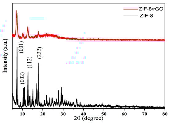 The ZIF-8/rGO nanocomposites were made by an in situ growth method with rGO as a structural template [29]. Specifically, 0.041 g and 0.074 g of Zn(NO3)2·6H2O and 2-Mim, respectively, were dissolved in two separate 10 mL portions of methanol. Afterwards, 10 mg of rGO was dispersed in Zn(NO3)2·6H2O methanolic solution and then exposed to ultrasonic energy below 30 °C for 6 h to achieve homogeneous dispersion. Thereafter, the solution of 2-Mim was poured to the above mixture and stirred for 6 h to promote the growth of the ZIF-8 crystals on rGO sheets.