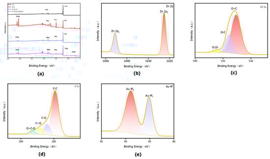 XPS images of the materials: (a) XPS survey spectra of rGO, ZIF-8, ZIF-8/rGO and rGO/ZIF-8/CS@AuNPs; (b) High-resolution Zn 2p XPS spectrum of rGO/ZIF-8/CS@AuNPs; (c) High-resolution O 1s XPS spectrum of rG-O/ZIF-8/CS@AuNPs; (d) High-resolution C 1s XPS spectrum of rGO/ZIF-8/CS@AuNPs; (e) High-resolution Au 4f XPS spectrum of rGO/ZIF-8/CS@AuNPs.