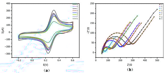 To validate the performance of the immunosensor, CV and EIS measurements were carried out in an electrolyte containing 5 mM [Fe(CN)6]3−/4− and 0.1 M KCl (pH 7.4). Figure 8a,b show the CV curves and EIS plots of the electrodes at different modification stages. As shown in Figure 8a, the bare GCE (curve a) exhibits the smallest redox peak current. CS@AuNPs (curve g) and rGO (curve h) are the main contributors to enhancing the interfacial conductivity. In ZIF-8/rGO (curve b), ZIF-8 indirectly improves the loading of nanoparticles by providing a high specific surface area and a nanostructured framework. When the first ZIF-8/rGO layer (curve b) is further coated with a second CS@AuNPs layer (curve g) to construct the bilayer CS@AuNPs/ZIF-8/rGO structure (curve c), the peak current increases markedly, indicating that the bilayer configuration generates a stronger electrochemical response than the corresponding single-layer structures. This can be attributed to the fact that the bottom ZIF-8/rGO layer offers a high surface area and a continuous conductive network, supplying more exposed active sites and low-resistance pathways for electron transfer between the electrode and the electrolyte interface. The top CS@AuNPs layer introduces a large number of uniformly dispersed catalytic sites, while the chitosan film helps to stabilize the nanoparticles and improve interfacial contact with the electrode surface. As a result, the electrode modified with the bilayer material delivers higher peak currents and superior electrochemical performance. Upon successive immobilization of CA15-3 antibody, antigen, and BSA on the CS@AuNPs/ZIF-8/rGO/GCE (curves d, e, and f), the peak currents decrease stepwise, because the formation of an insulating protein layer at the electrode surface hinders the access of the [Fe(CN)6]3−/4− redox probe to the interface and increases the resistance to electron transfer.