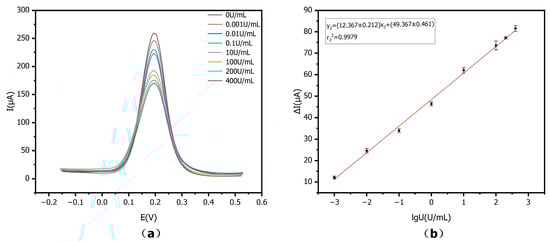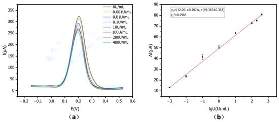 Standard calibration curve: (a) DPV values at different CA15-3 activities: 0, 0.001, 0.01, 0.1, 10, 100, 200, and 400 U/mL; (b) Linear equation for logarithm of CA15-3 activity versus peak current difference (n = 3).