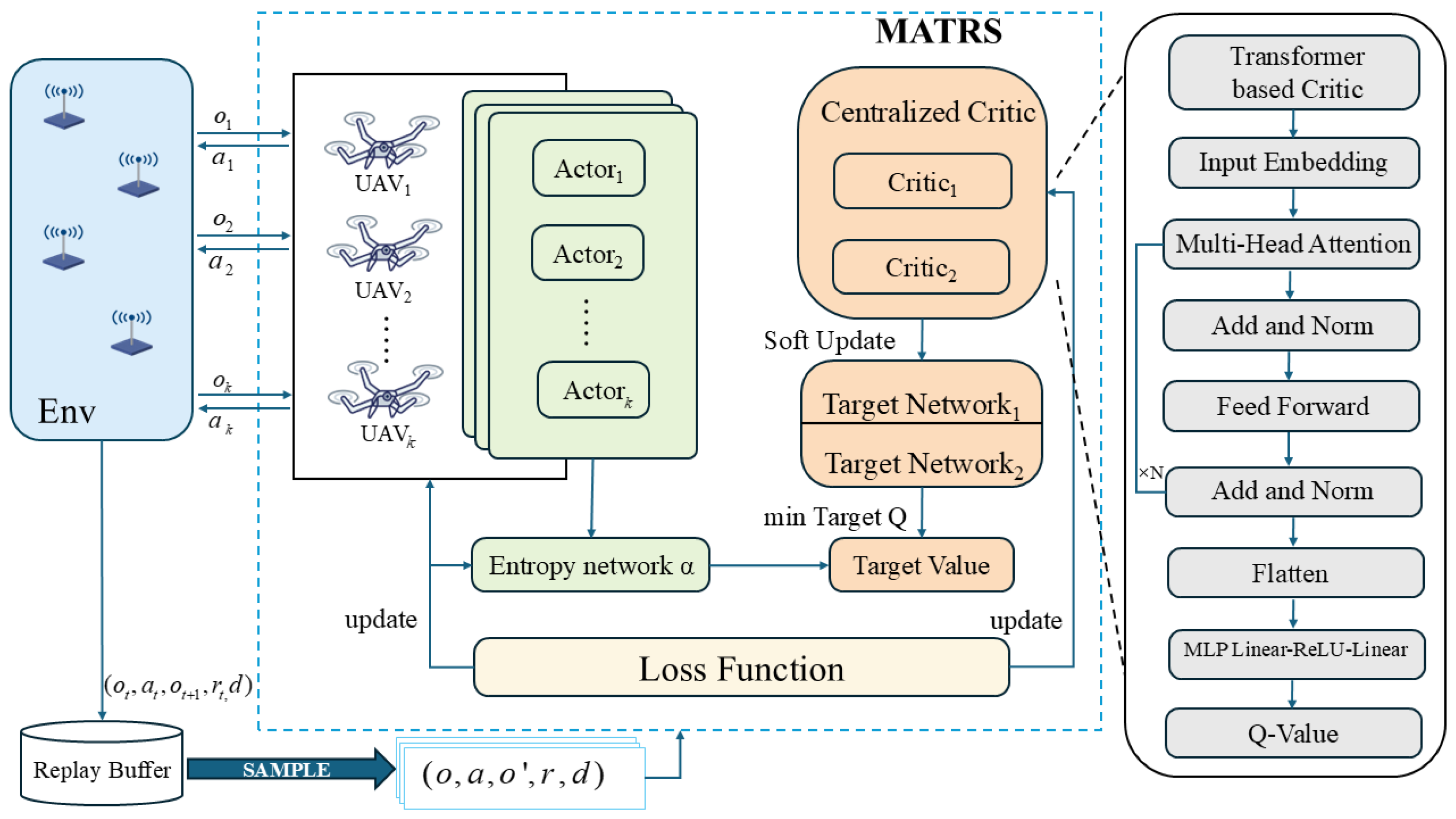 Integration of a Transformer architecture to enhance inter-agent collaboration. Diverging from conventional coordination mechanisms, this work incorporates a Transformer encoder within the critic network of the MASAC framework. By leveraging the self-attention mechanism, our approach enables the system to dynamically weight the importance of information from different agents, effectively capturing long-range, global spatiotemporal dependencies. This facilitates a more sophisticated and far-sighted form of cooperative decision making, particularly in scheduling data collection tasks among UAVs.