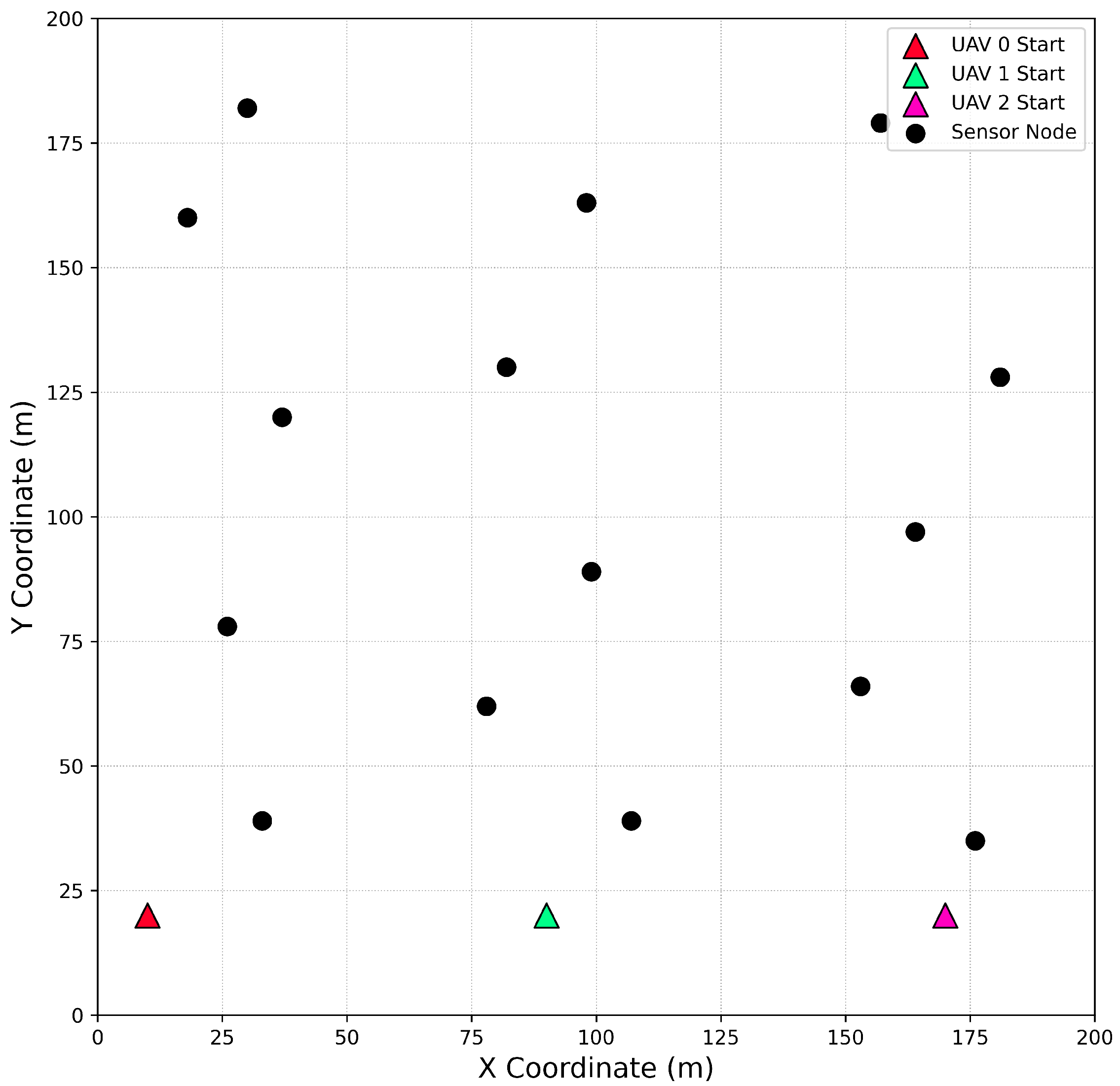 The data collection task is executed by a fleet of K homogeneous UAVs, denoted by the set . To simplify the analysis and focus on horizontal trajectory optimization, all UAVs are assumed to maintain a constant flight altitude of H. This altitude is typically chosen to balance communication coverage area with signal quality and to ensure safe clearance above crops.
