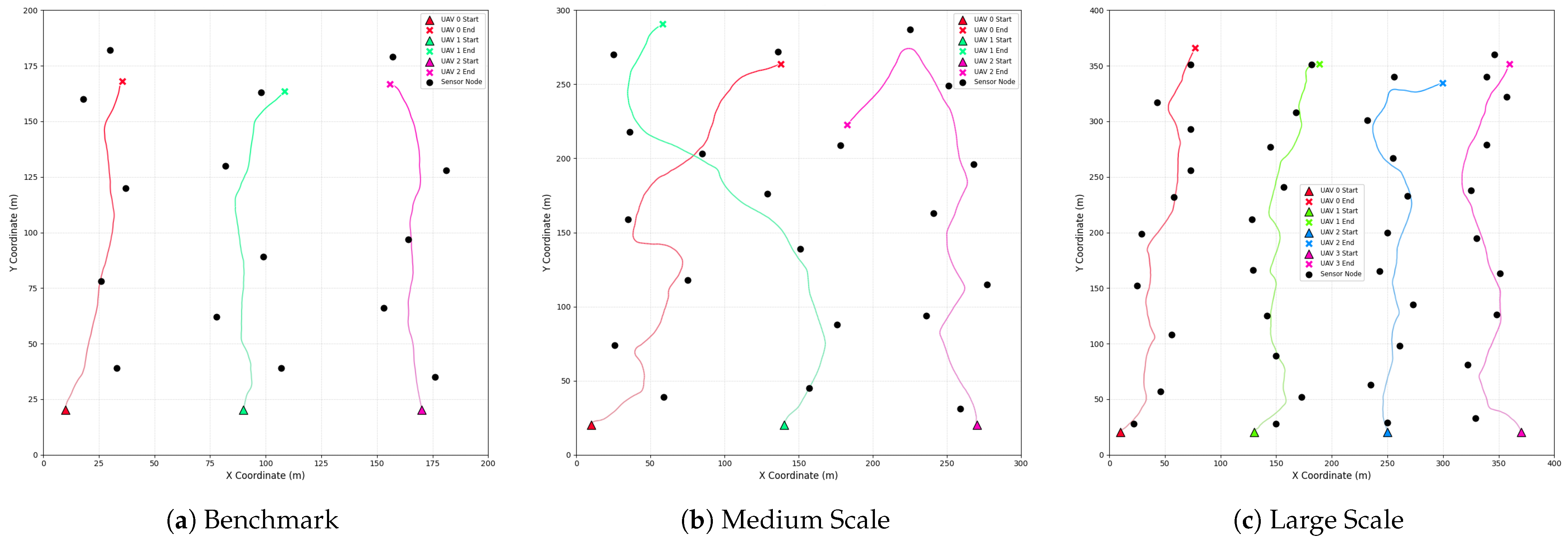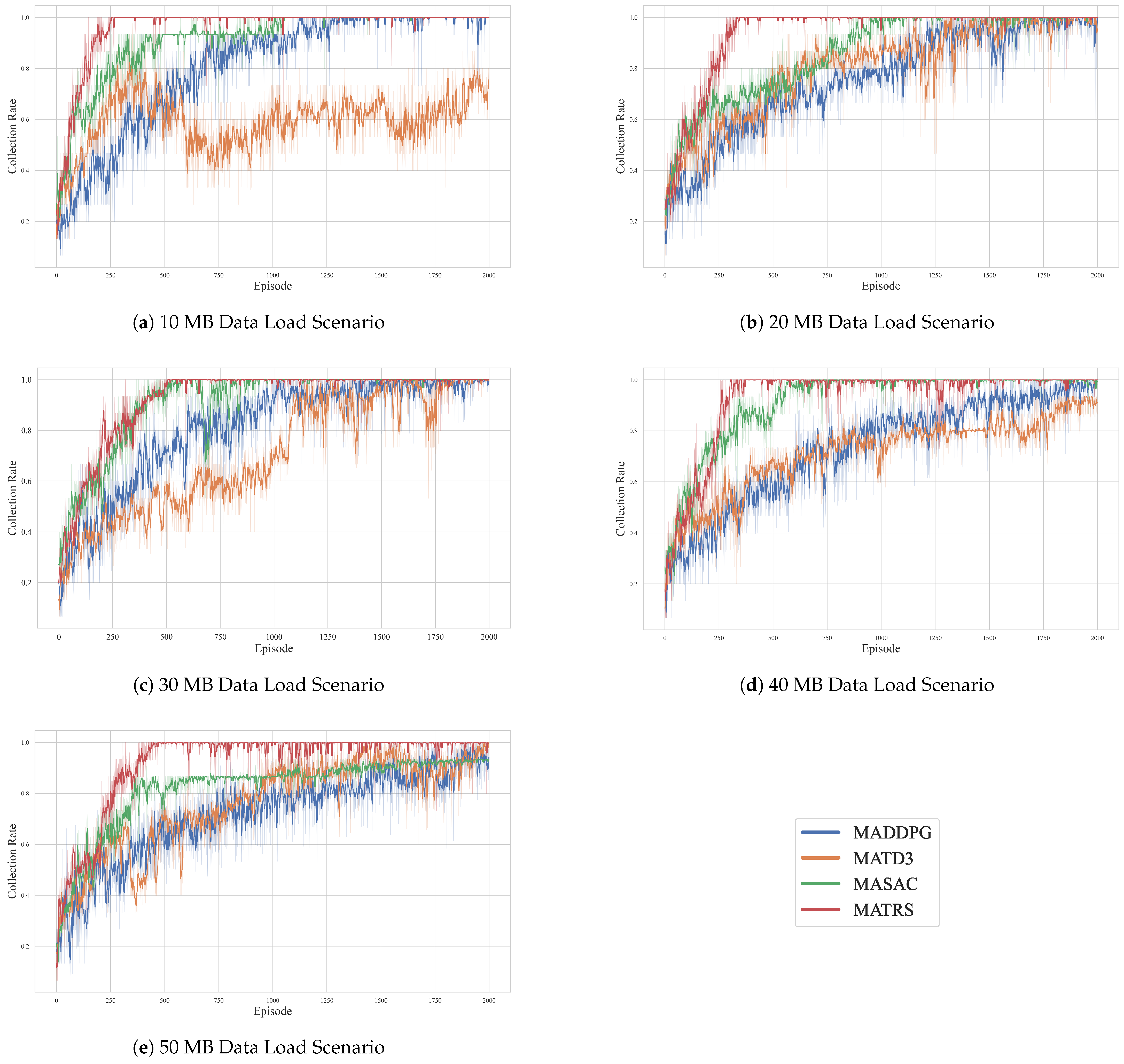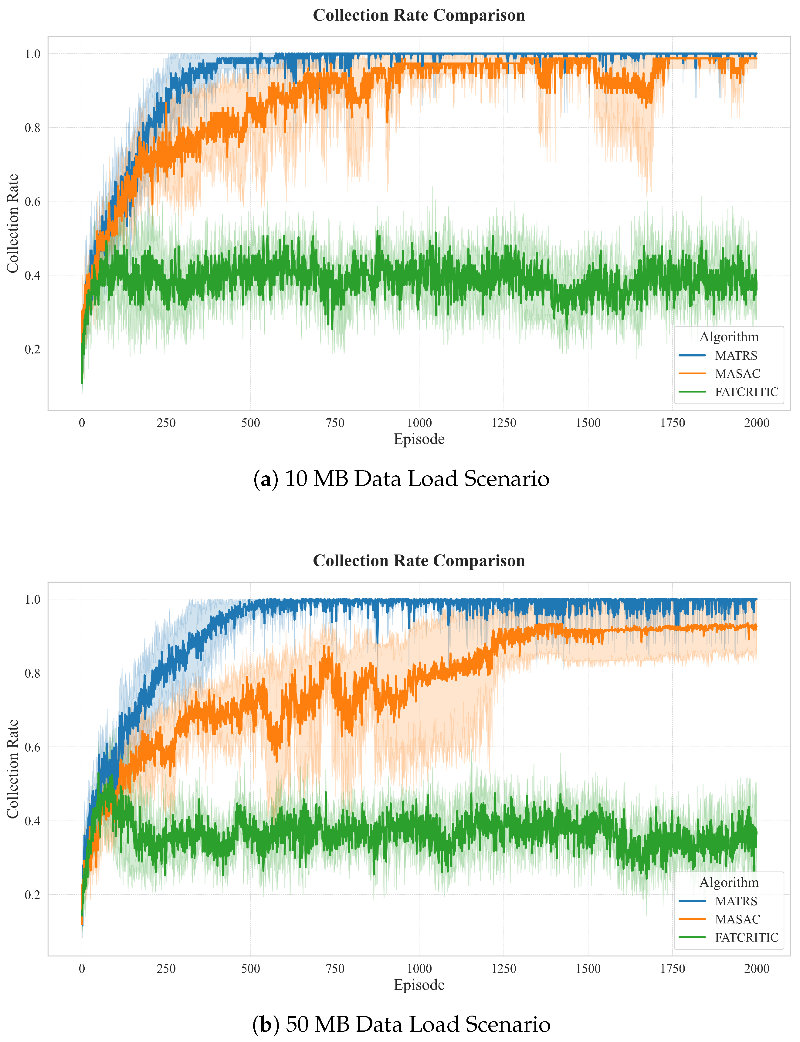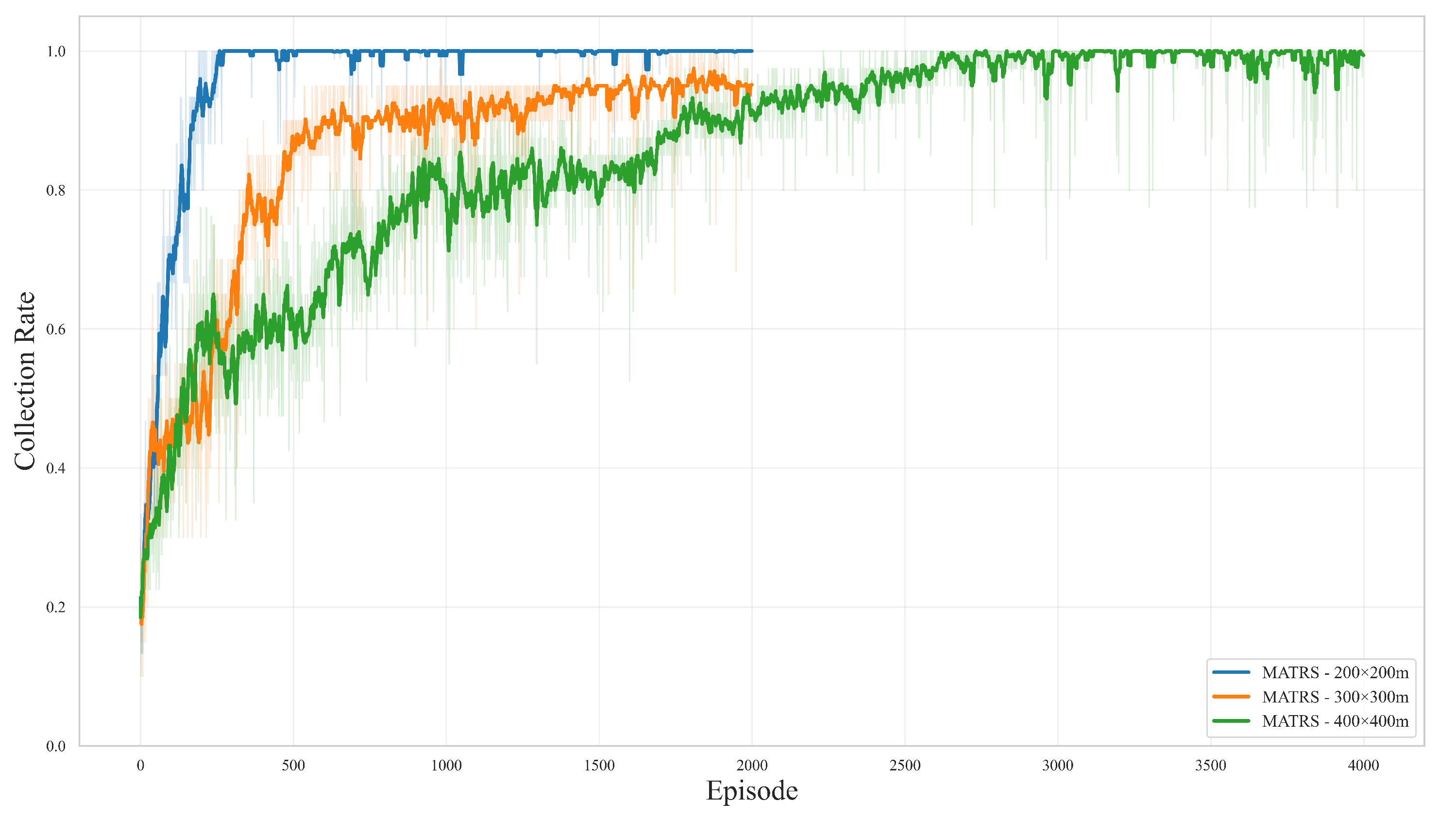 Comprehensive experimental validation and scalability analysis in a smart agriculture scenario. We conducted rigorous experiments in a simulated agricultural environment, benchmarking the proposed MATRS algorithm against several state-of-the-art baseline methods. The empirical results demonstrate that MATRS achieves superior performance, exhibiting a significantly higher data collection rate and a shorter mission completion time. Furthermore, by evaluating the algorithm across various problem scales, we confirm its robustness and excellent scalability.