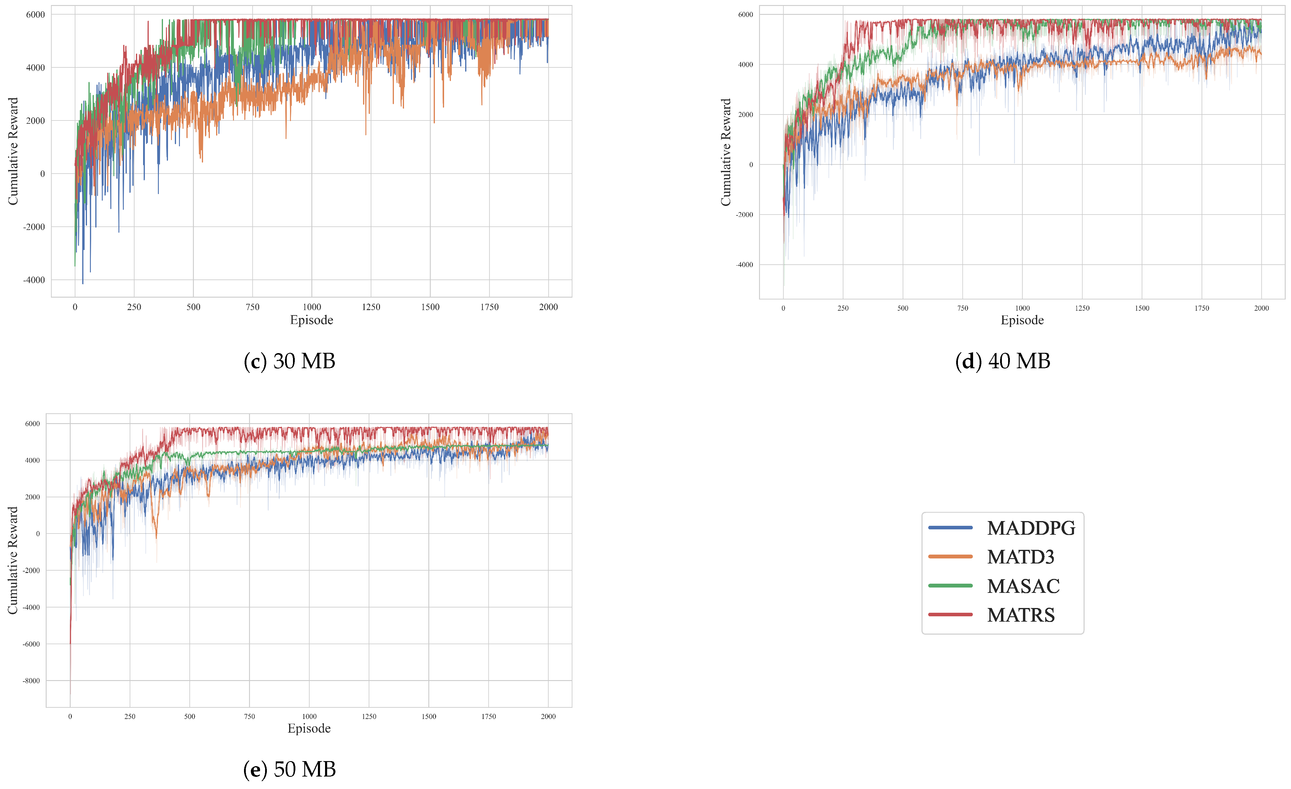Through a series of comprehensive simulation experiments, we have demonstrated the significant performance benefits and promising scalability of MATRS. Compared with established baseline algorithms such as MADDPG, MATD3, and MASAC, MATRS consistently exhibited faster convergence and greater stability across various data load scenarios. This superior efficiency is starkly highlighted when comparing MATRS with MASAC, where across all five data load scenarios, MATRS reduced the steps required for task completion by 10% to 30%. Furthermore, the visualization of the final trajectories provided compelling evidence of an emergent and efficient “task-space partitioning” strategy, where the UAV swarm autonomously divides the mission area for conflict-free coverage. This intelligent cooperative behavior, enabled by the powerful representation capacity of the Transformer critic, underscores the algorithm’s ability to solve complex coordination problems. Finally, scalability tests in larger and more complex environments confirmed the robustness and promising generalization capabilities of the proposed framework.