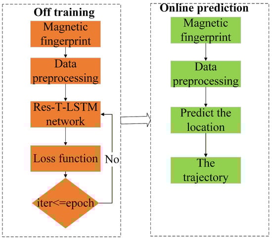 Figure 1. Flowchart of the magnetic fingerprint positioning algorithm using Res-T-LSTM.