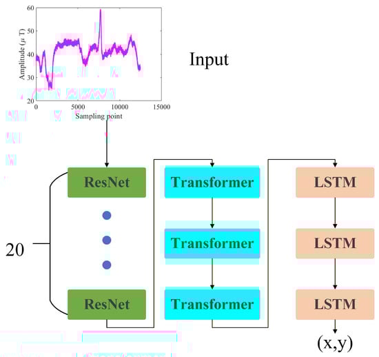 To fully exploit the rich spatiotemporal features in magnetic sequences collected by smartphones, a novel hybrid network is proposed, as shown in Figure 3. The model comprises 20 ResNets, 3 transformer modules, and 3 LSTM units, enabling simultaneous capture of the temporal evolution of magnetic signals and their local spatial patterns, thereby addressing the limitations of conventional methods in feature extraction and positioning accuracy.