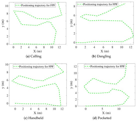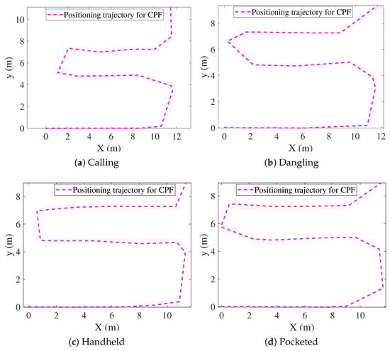 FPF and CPF exhibit relatively large positioning errors, particularly in dynamic scenarios such as the dangling and pocketed modes, where rapid device-orientation changes weaken the reliability of magnetic fingerprint matching. For instance, FPF yields an RMSE of 2.03 m in the dangling mode, while CPF reaches an RMSE of 1.79 m in the pocketed mode, indicating noticeable performance degradation under unstable motion conditions.