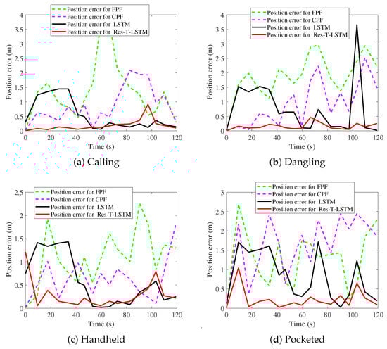 Table 2 summarizes the positioning errors of the FPF, CPF, LSTM, and the proposed Res-T-LSTM models under four smartphone placement modes. Several observations can be drawn.