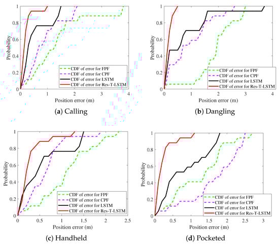 Figure 9, Figure 10, Figure 11, Figure 12, Figure 13 and Figure 14 present the positioning trajectories, positioning errors, and cumulative distribution functions (CDFs) for the FPF [35], CPF [36], LSTM [37], and Res-T-LSTM under four smartphone placement modes: calling, dangling, handheld, and pocketed. As shown in the figures, the FPF, CPF, and LSTM methods exhibit noticeable deviations and distortions in certain regions, particularly at turning points and trajectory segments with large dynamic posture changes, leading to pronounced positioning errors. These errors mainly arise from reduced magnetic-fingerprint matching accuracy or instabilities in inertial features. In contrast, the proposed Res-T-LSTM method maintains superior accuracy in preserving the overall trajectory shape, capturing key turning points, and ensuring trajectory continuity, effectively suppressing cumulative error propagation.