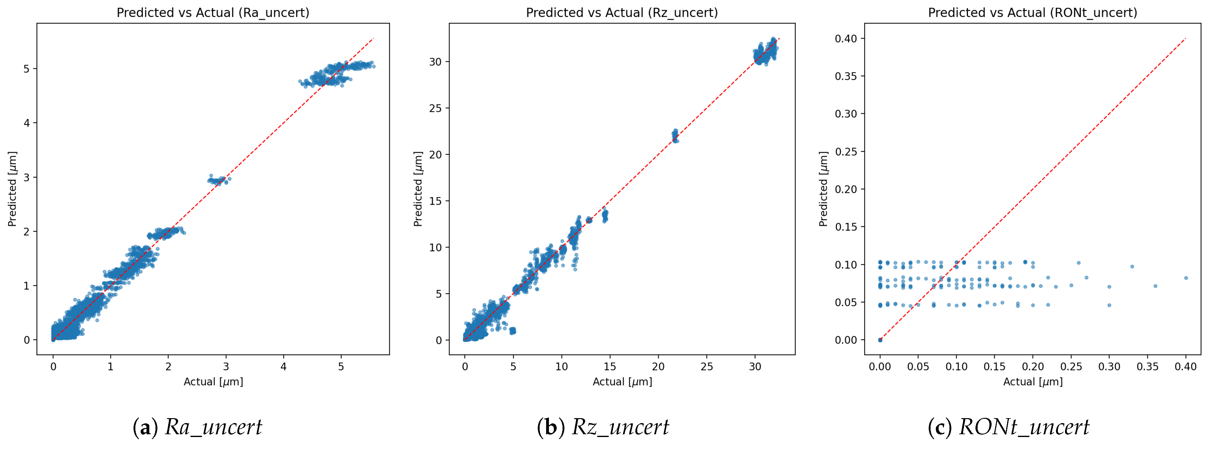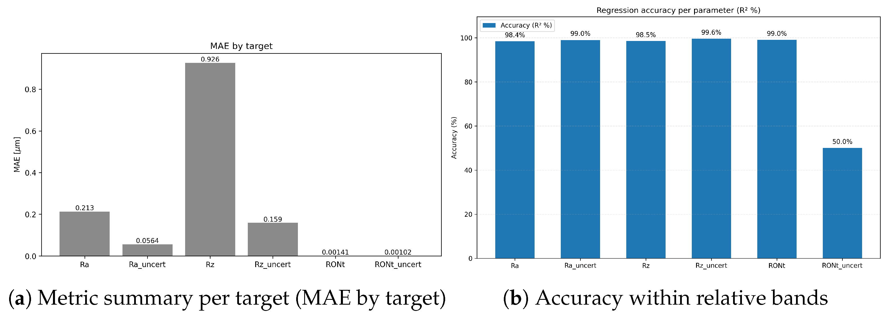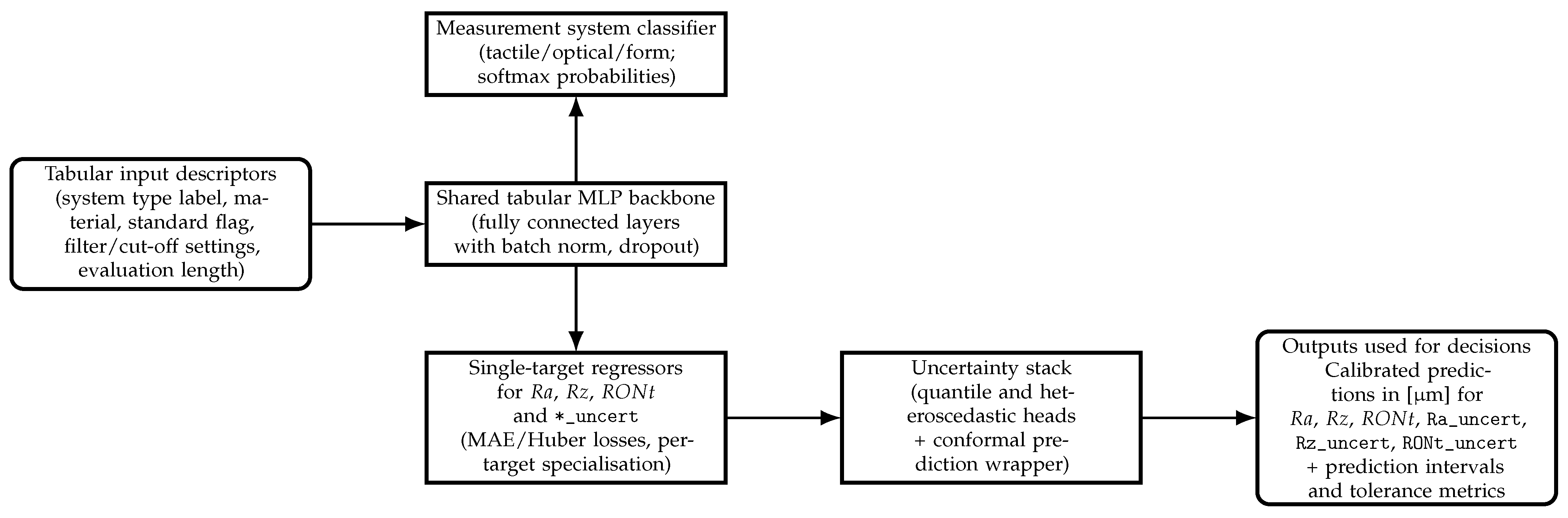 - RONt-specific considerations. Compared to and , the target exhibits lower predictive accuracy, and RONt_uncert shows reduced learnability. Two primary causes are identified: (i) instrument heterogeneity—the dataset aggregates measurements from different roundness testers (types/generations) with distinct metrological characteristics, probing/fixturing, filtering, and evaluation chains. This induces a cross-instrument domain shift that a single tabular model only partially accommodates, depressing accuracy even with standardisation. (ii) uncertainty label fidelity—the reported standard uncertainty for reflects a partial budget where not all contributing components are precisely known, modelled, or logged during evaluation. In our cohort, partner-site setups for roundness exhibited greater heterogeneity than those for roughness, further increasing cross-site variability and affecting both point accuracy and uncertainty labels. The resulting label noise/bias constrains the attainable for RONt_uncert. Mitigations include harmonised acquisition protocols, explicit inclusion of instrument metadata (make/model, probe, filter stack) as features or conditional heads, cross-instrument calibration layers, and standardised, fully specified uncertainty budgets (e.g., decomposed repeatability/reproducibility components) to improve label quality. Notably, multi-output training yields a slightly higher for (Table 2), which likely reflects joint-loss emphasis on that scale at the expense of other targets—an instance of negative transfer across heterogeneous outputs.