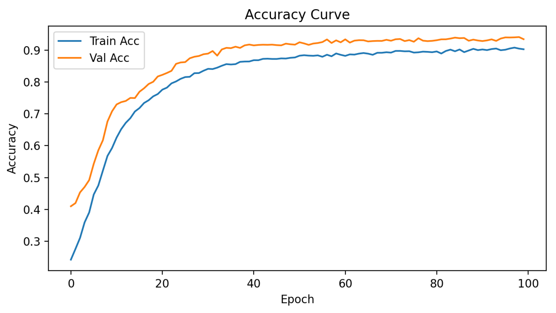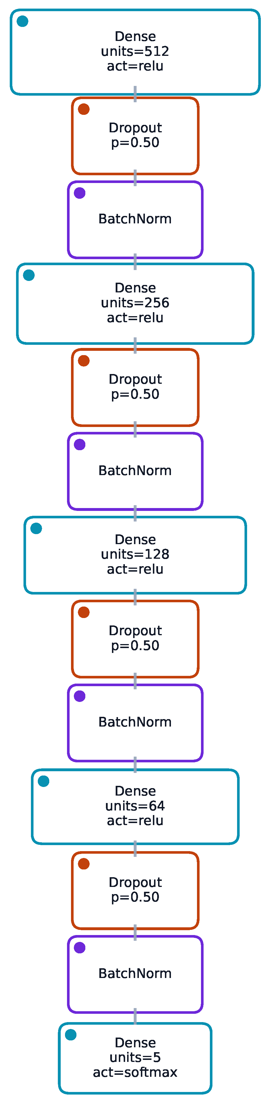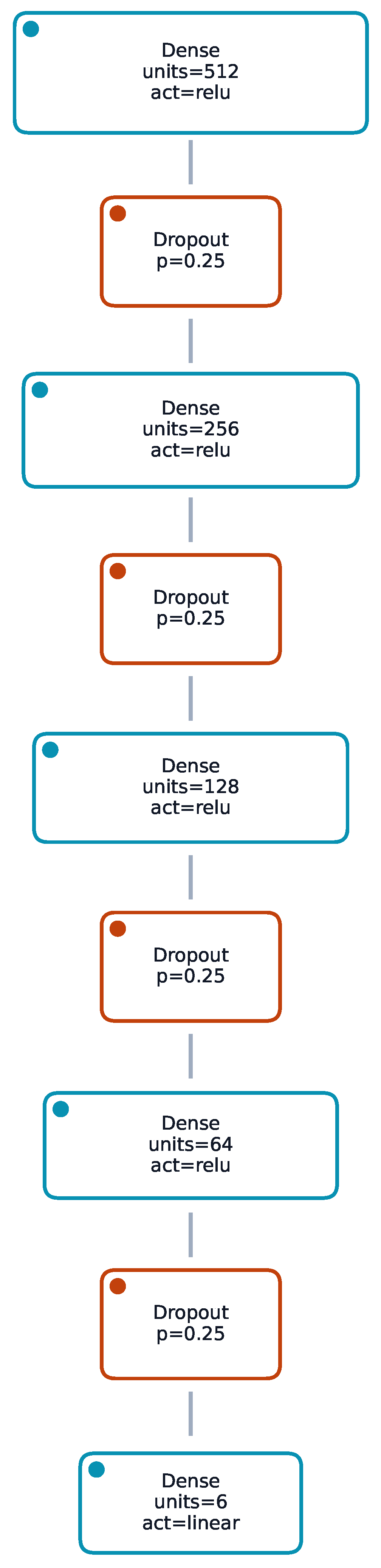 - Architecture selection. Depth and width were selected by a coarse grid search (depth 3–5; widths 64–512) balancing fit and overfitting risk. The 512–256–128–64 classifier achieved the best validation accuracy without variance inflation, while 64–32 sufficed for the regression backbone when paired with robust losses and regularisation. The final settings reflect a trade-off between accuracy, stability, and model simplicity rather than hand-picked architectures.