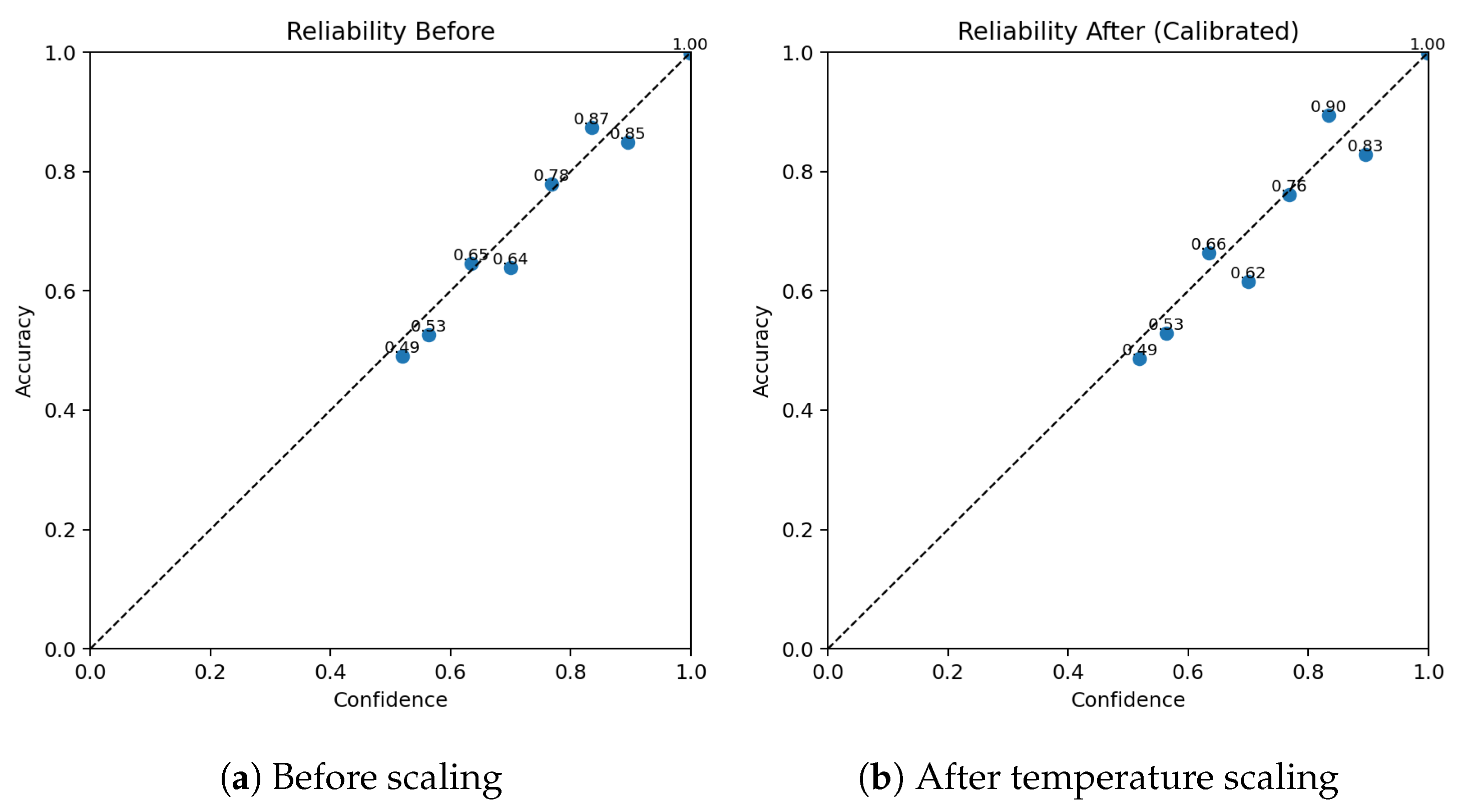 - Calibration effect: expected calibration error (ECE, 15-bin, test split) changed slightly from 0.00504 (pre-scaling) to 0.00503 after temperature scaling, indicating near-unchanged probabilistic calibration (reliability curves shown in Figure 7).