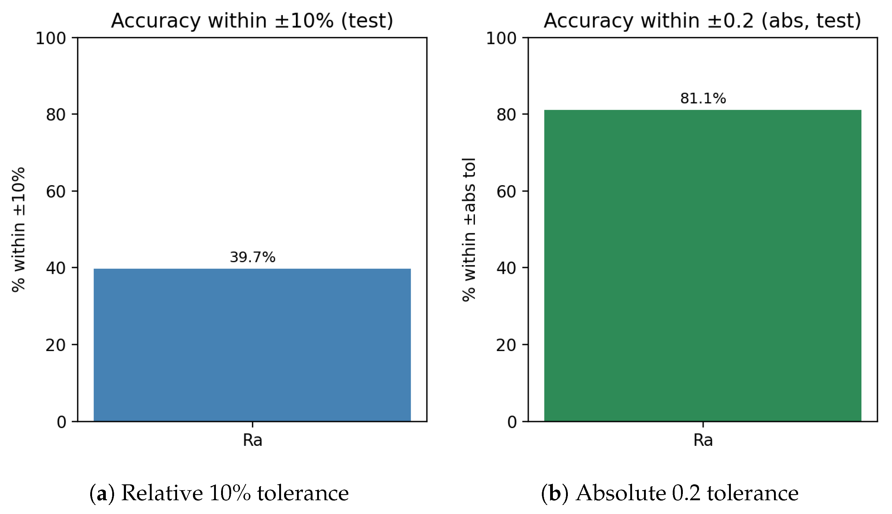 - Class imbalance. The TP class dominates support, which contributes to higher weighted metrics and increased dispersion for minority classes. Inverse-frequency class weights mitigated collapse, but residual performance differences across classes reflect the inherent imbalance in available measurements. As shown in Figure 9, Figure 10 and Figure 11, the main performance results for the single-target regression models are presented, including tolerance-based accuracy and predicted vs. actual scatter plots for the primary parameters.
