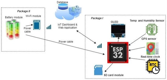 The platform follows a two-package layout to simplify installation and ensure electrical isolation. Packet I houses a sensing and compute system: an ESP32 microcontroller with Wi-Fi/Bluetooth, a calibrated temperature/RH sensor, a GPS module, a real-time clock (RTC), and a microSD card for resilient local logging. Packet II contains power and connectivity: a LiFePO4 battery pack with protection, DC–DC conversion (12 V and 5 V rails), and a Wi-Fi modem. The units are coupled via a keyed harness with over-current protection. Environmental measurements and GPS are timestamped on-device and published via MQTT when a link is available; otherwise, records accumulate locally and are backfilled upon reconnection. A web application renders live and historical views with user-level access controls. Figure 1 presents the system architecture. The components of this system are as follows: