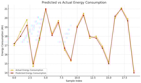 Across ∼10,000 samples, LR and GBM explained a large share of variance (), with the test MAE close to 0.77 A·h. On the same chronological split, the mean and persistence (last-value) baselines yielded higher errors and lower than LR/GBM/RF, confirming that the learned models meaningfully outperform trivial predictors. Residual plots showed no obvious trend of or inflation in variance across the operating range. RF achieved comparable errors while offering interpretable attributions: temperature was the dominant predictor in the fitted models, followed by route duration and RH (e.g., ∼55%, 25%, 20%). The multilayer perceptron (MLP) underperforms compared to the linear and tree-based models on this dataset. We attribute this to the relatively small sample size (∼10,000 records across four days) and the low-dimensional, nearly monotonic relationship between the predictors (temperature, RH, elapsed duration, transmission activity) and power draw. In this regime, a more flexible neural architecture offers limited benefits and can overfit without careful regularization, whereas well-tuned linear and ensemble models already capture the dominant trends. Importance is reported as permutation importance on the RF model, and pairwise correlations and variance-inflation checks do not indicate severe multicollinearity among the predictors. These predictions were used only to validate simple adjustments (shorter sampling and more frequent bursts during high temperatures) while keeping a one-day reserve; the primary focus remains on the system’s reliable data acquisition and continuity. We selected LR and GBM for their strong accuracy (test , MAE A·h), and RF for its interpretability; these predictions are used only for sizing verification and simplifying the configuration of the deployed logger. The permutation importance for RF is shown in Figure 6, while Figure 5 reports the MAE/MSE/R2 for the five base models (LR, SVM, k-NN, GBM, and MLP); RF achieves MAE and R2 values comparable to those of LR and GBM (see above), but is omitted from the bar chart to keep the comparison uncluttered. Figure 7 focuses on RF as the most interpretable ensemble, showing the predicted versus actual energy consumption on the held-out set.