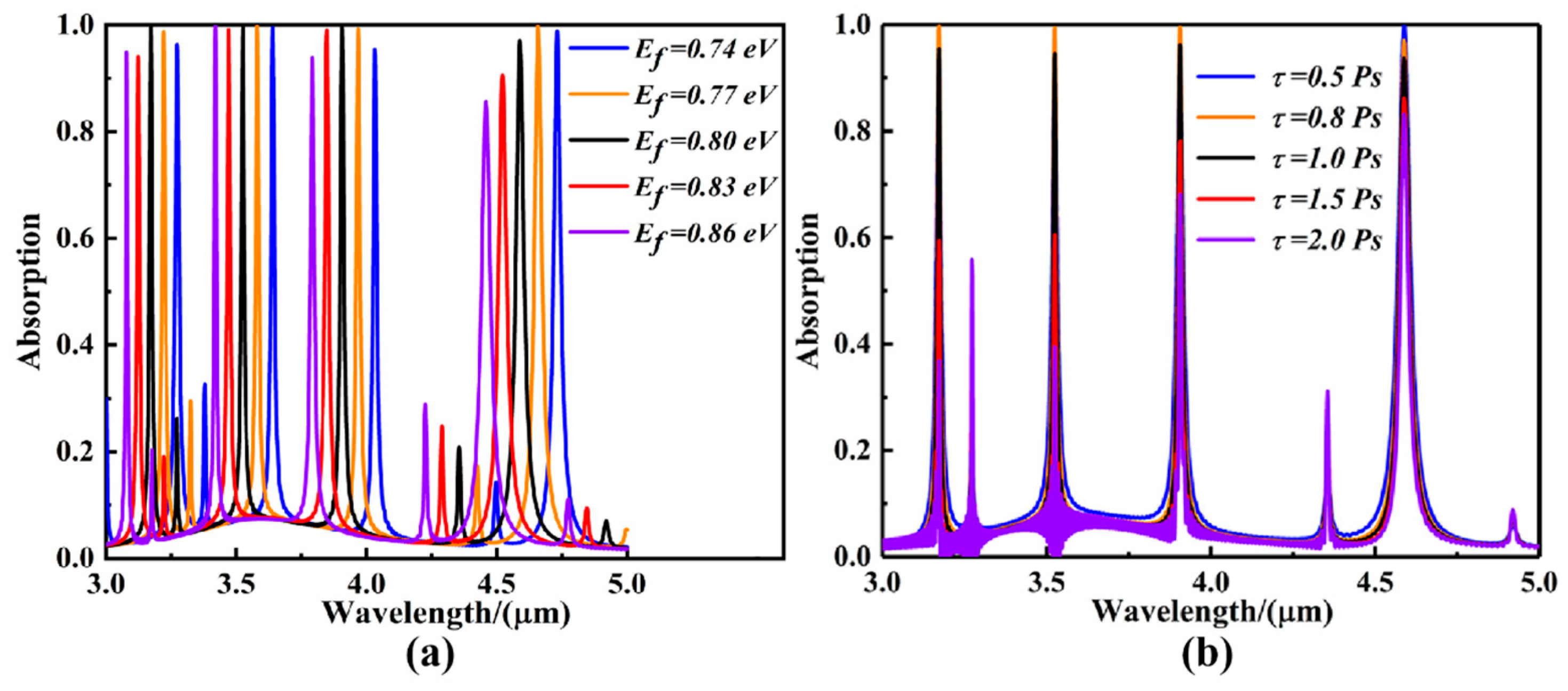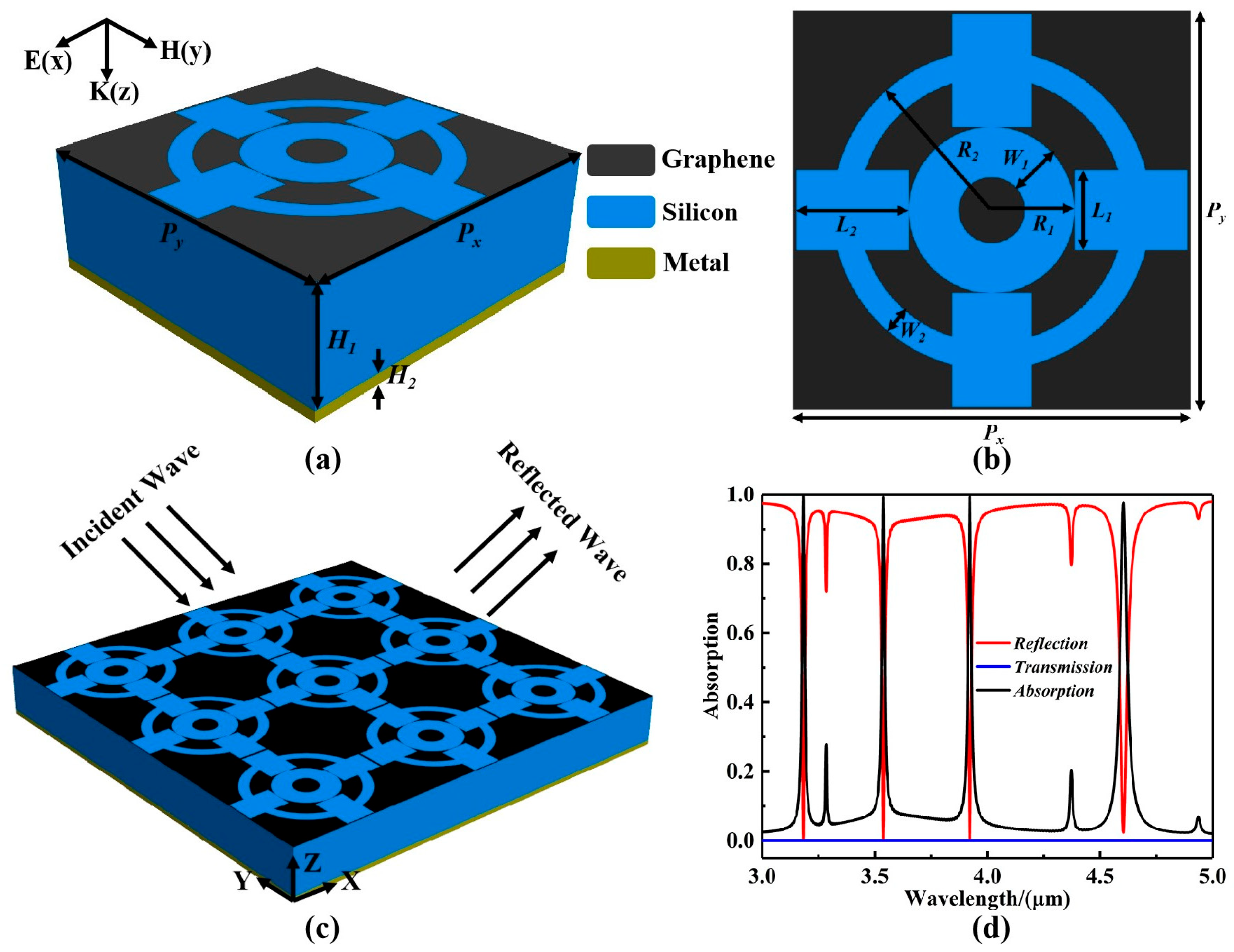 - High absorption efficiency can be achieved at four specific resonance wavelengths, and the dynamic regulation of resonance wavelength and absorption efficiency can be achieved by adjusting the grid voltage or through chemical doping.