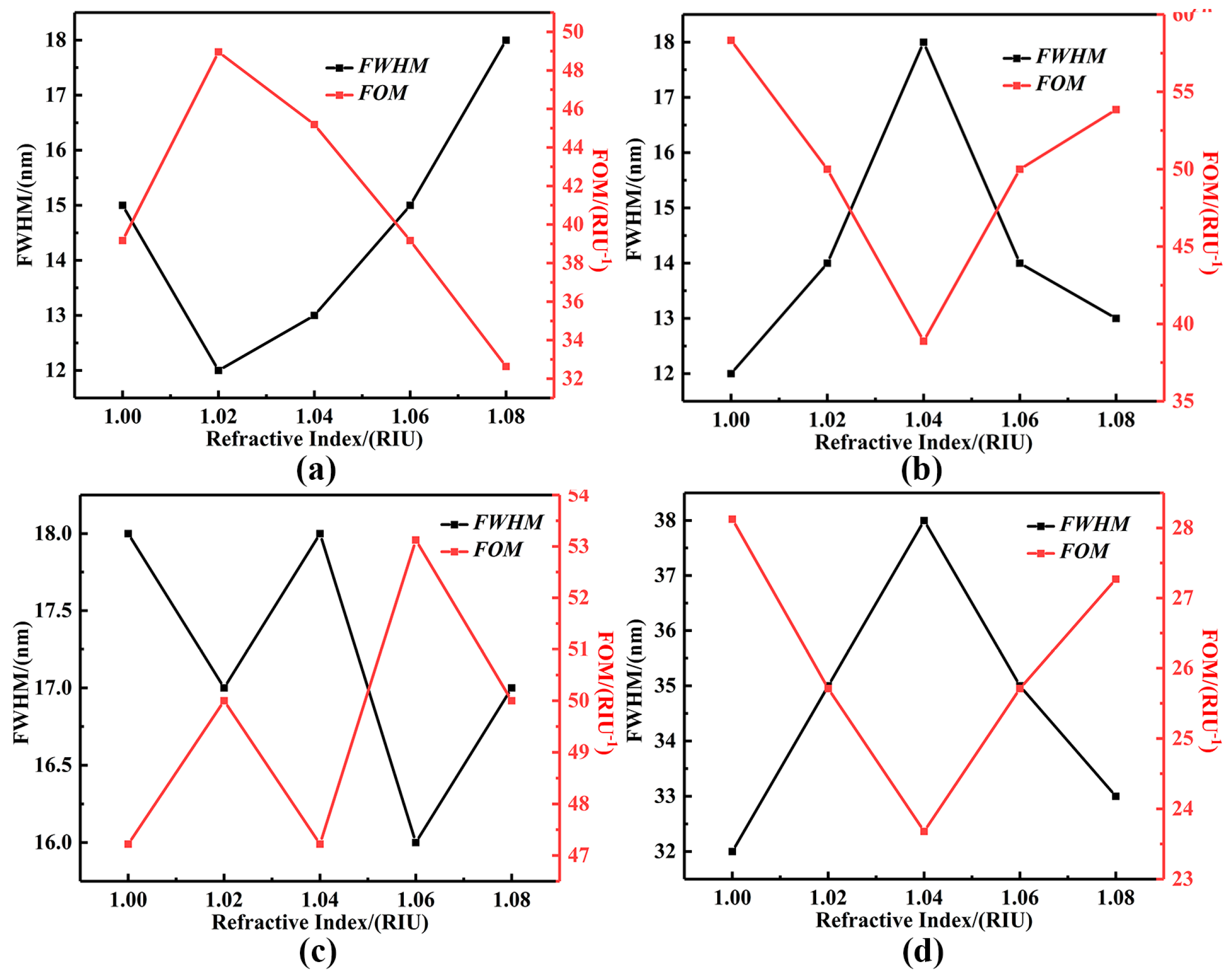 - With the change in refractive index in the test environment, the maximum sensitivity can reach 900.0 nm/RIU and the maximum FOM is 58.34 RIU-1, which is better than that of similar sensors.