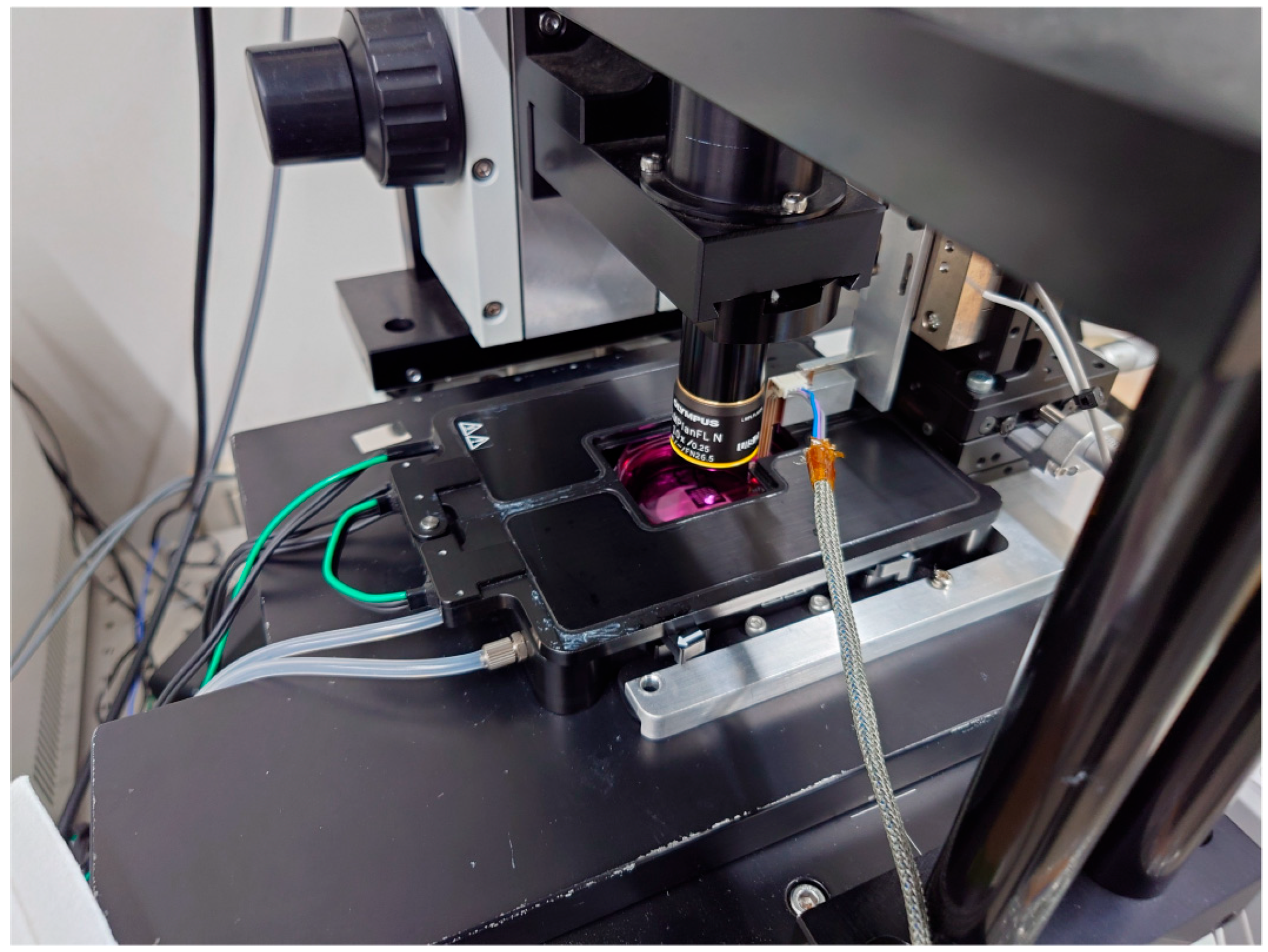 Figure 2. An incubator for hiPSC-CMs with movable plates, all of which are built up on the optical microscope.