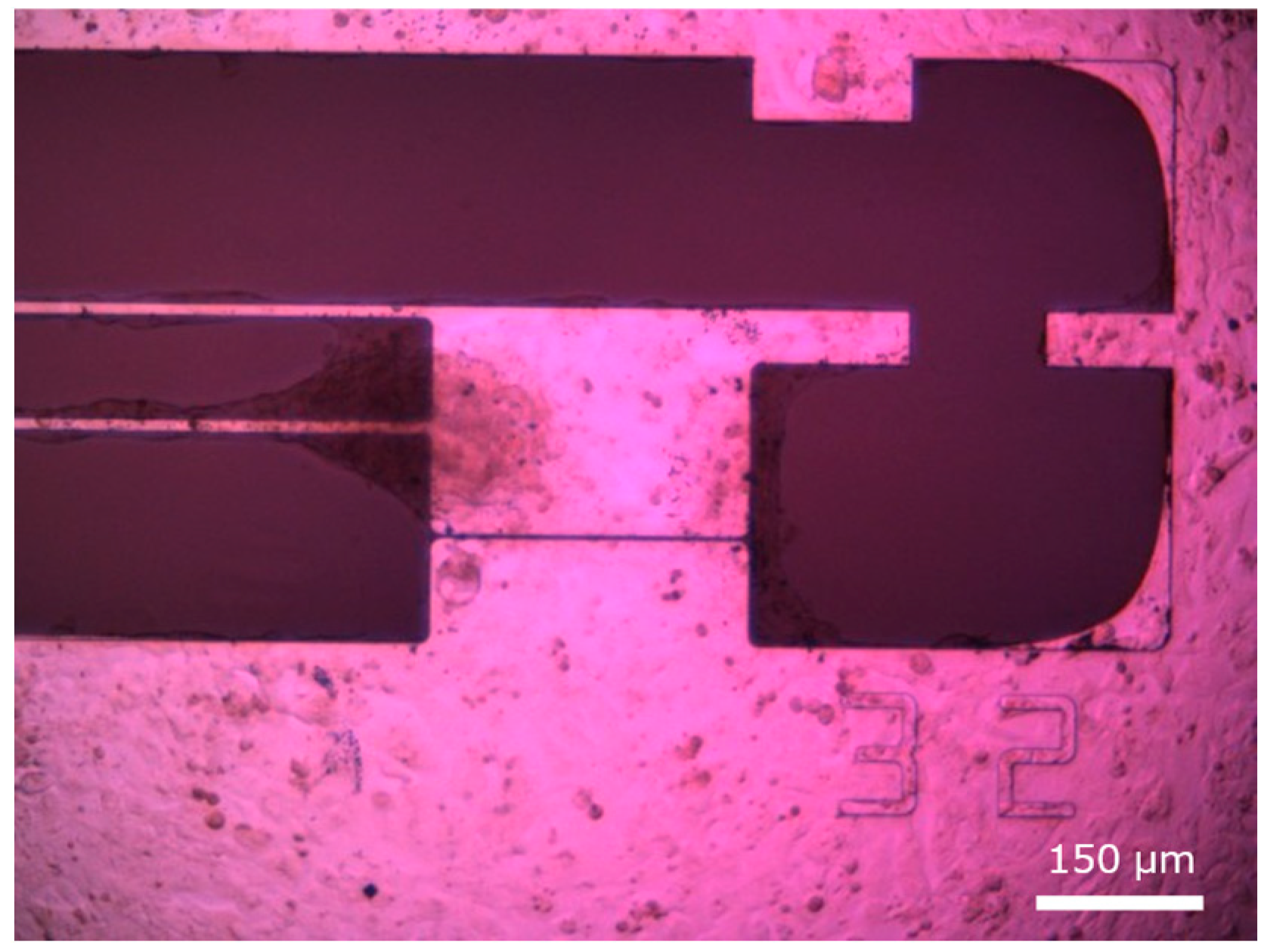 The movable culture plate, illustrated in Figure 3, is designed and fabricated to accommodate the size and contractile force of hiPSC-CMs [14,15,16]. It is made of single-crystal silicon, ensuring biocompatibility with cardiomyocytes, and consists of two components: a movable and a fixed part, separated by a 5 µm gap. The plate is fabricated using standard MEMS processes, with a total size of 1 cm × 1 cm, and contains 24 movable–fixed pairs. The fixed part is 253 µm thick and adheres to the dish bottom; the movable part is supported by two thin arms (length: 1100 µm; width: 10 µm; thickness: 2 µm) and can easily deform in response to hiPSC-CM contractions.