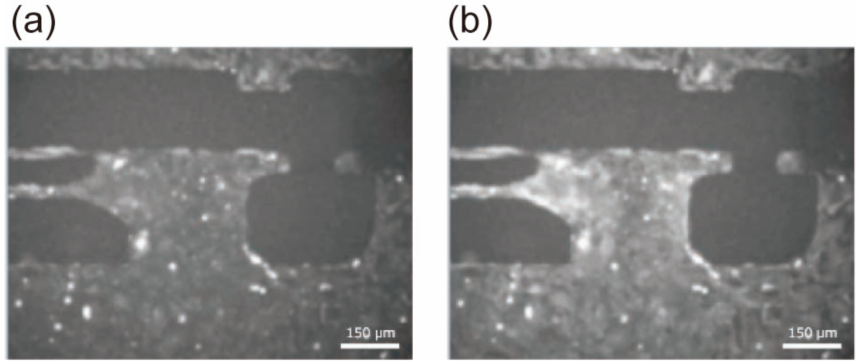 Figure 5. Fluorescent microscopic image of hiPSC-CMs during beating. The probe name is Fluo-4, with an excitation wavelength of 495 nm and an emission wavelength of 518 nm. The exposure time for imaging was set to 110 ms. (a) The moment when the hiPSC-CM cluster was relaxed; (b) the moment when the hiPSC-CM cluster was contracting.
