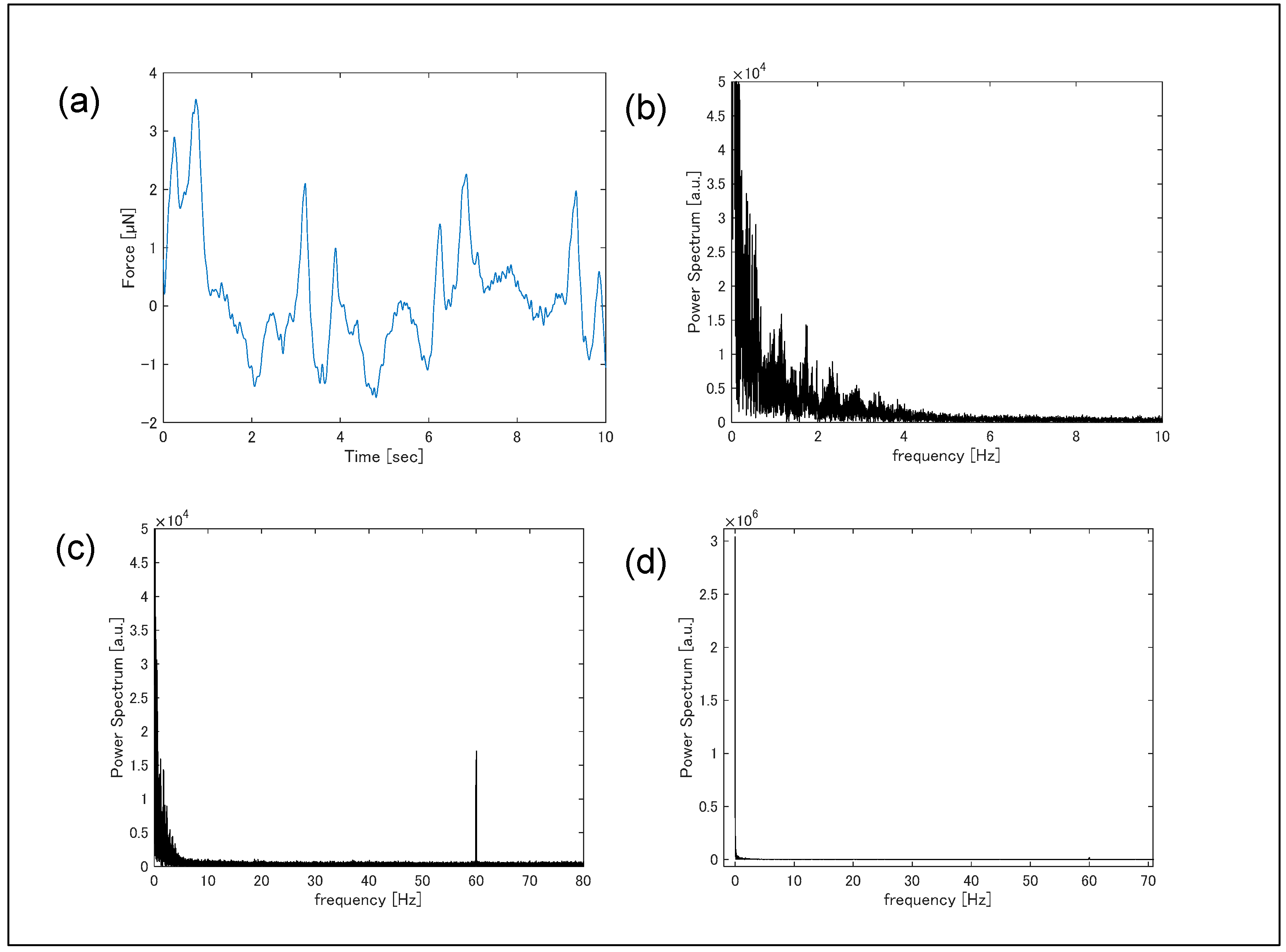 Figure 6. (a) Temporal variation in contraction force measured by the piezoresistive force sensor, and (bd) fast Fourier transformation of the temporal variation.