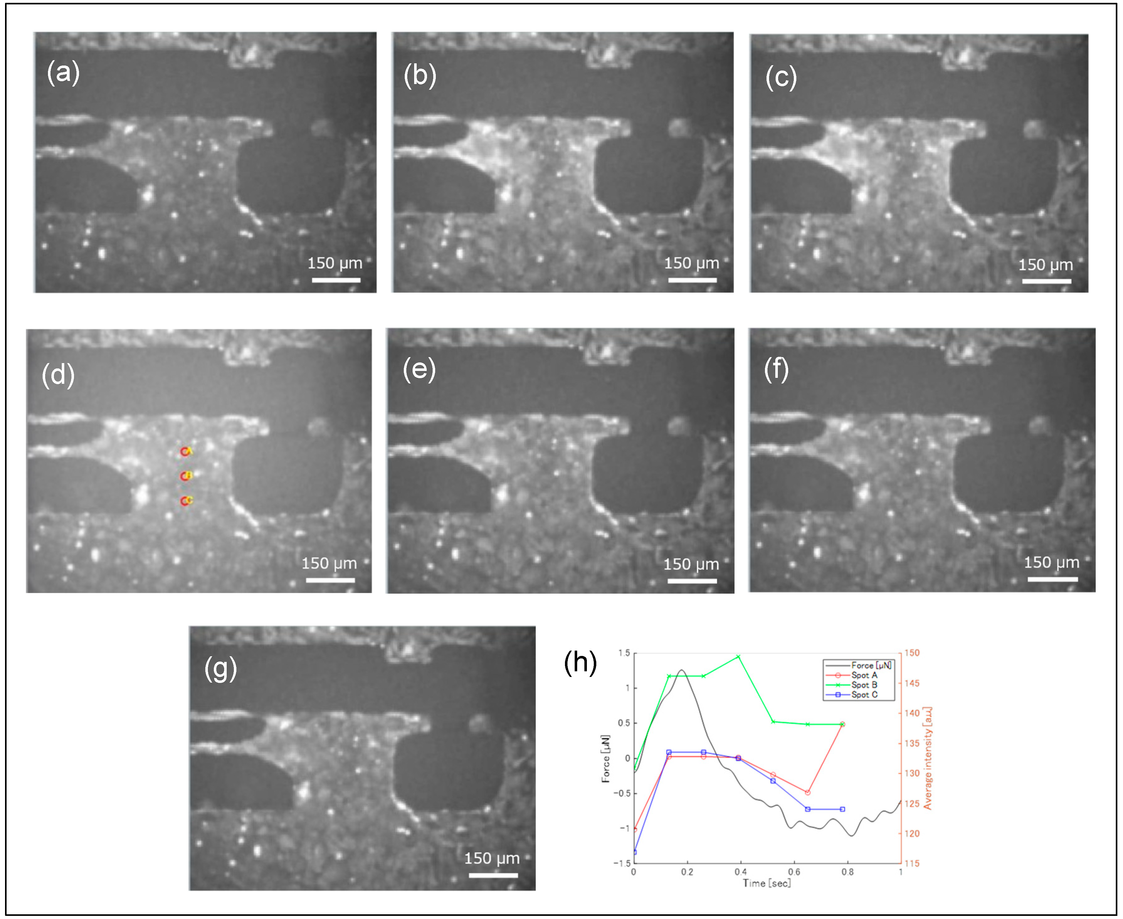 Figure 7. Fluorescent microscopic images of the hiPSC-CMs during a single cycle of beating, and temporal change in fluorescence intensity and a beating force. The fluorescence microscope images are arranged chronologically from (ag). The fluorescence image intensities at points A, B, and C shown in (d) are displayed in the graph in (h).
