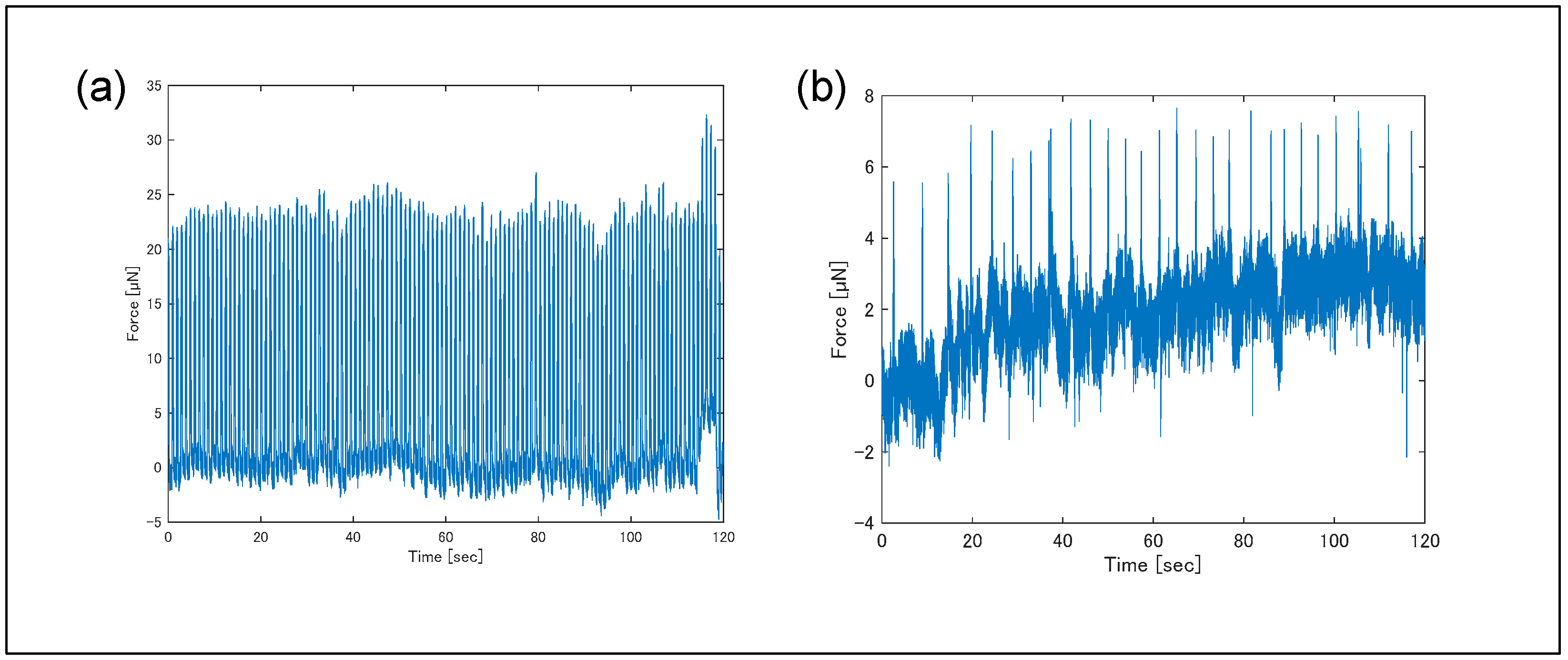 Figure 8. Temporal variation in contraction force measured (a) before and (b) after the fluorescent staining. Each measurement was performed multiple times; one example is shown here. Measurement temperatures were 36.4–36.5 °C for (a) and 36.0–36.8 °C for (b). Pulsatility was measured 14 days after seeding hiPSC-CMs onto plates. Fluo-4 (2–3 µM) was loaded for 15 min, 2 h after measuring (a), followed by measurement of (b). Pulsatility became unstable due to the influence of Fluo-4.