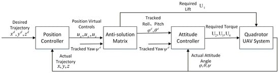 The attitude controller computes using errors in to achieve roll/pitch tracking for position stabilization and direct yaw control for orientation. The four control inputs are mapped to rotor speeds via (7). The overall control architecture of the quadrotor UAV adopts a dual-loop control scheme, as shown in Figure 2. It consists of an outer (position) loop that generates from trajectory errors and an inner (attitude) loop that computes for attitude tracking.