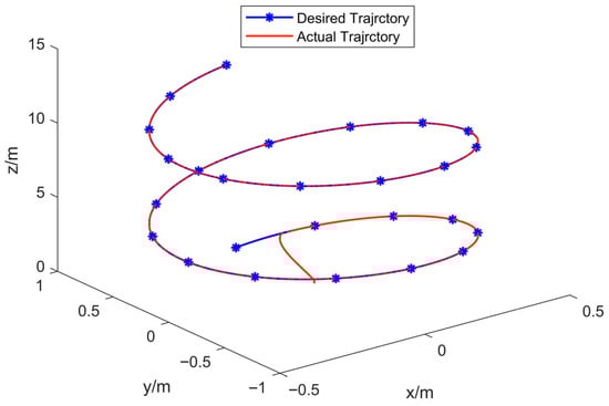 The initial position and attitude of the quadrotor are set to 0, with the reference trajectory being a spiral curve as follows: ; ; and . The reference heading angle is .