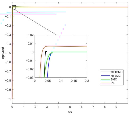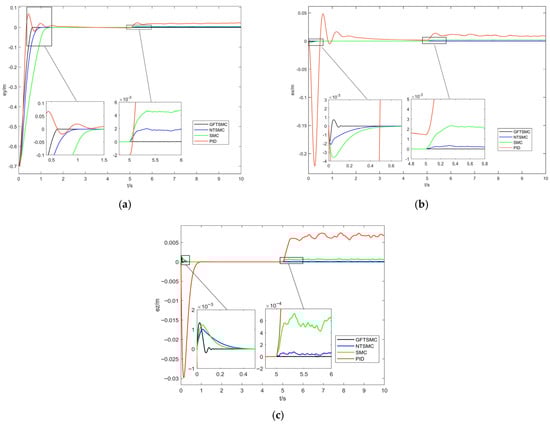 Figure 5 shows the yaw-angle tracking-error response curves of the quadrotor UAV under the four control methods. Table 2 shows the steady-state convergence time of the four control methods for reaching the desired yaw angle. The simulation results indicate that GFTSMC’s convergence time to reach the desired yaw angle is 0.047 s, which is 0.024 s, 0.027 s, and 2 s less than that of NTSMC, SMC, and PID control, respectively. Compared to PID control, SMC, and NTSMC, the steady-state convergence time of GFTSMC is reduced by 97.7%, 36.5%, and 33.8%, respectively. Therefore, GFTSMC can effectively improve the convergence speed of the attitude loop of the quadrotor UAV.