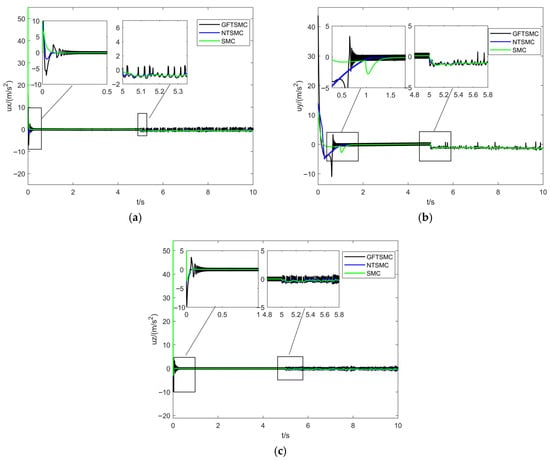 It can be seen that the tracking-error dynamics and sliding surface, reaching law, and controller design of both the position loop and attitude loop are consistent in form. Consequently, the stability proof for the attitude loop is identical to the analysis process of the position loop. Theorem 1 is also applicable to the attitude loop, and the designed nonsingular terminal sliding mode controller for the attitude loop can guarantee that the tracking error of the attitude-angle states in the system’s attitude loop converges to zero within finite time.