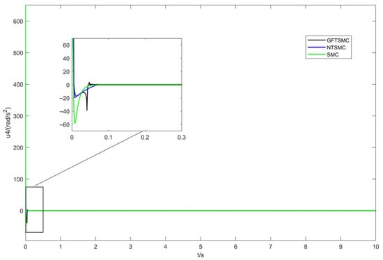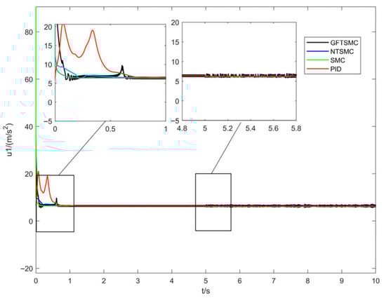 Figure 8 presents the total-lift response curves of the quadrotor UAV under the four control methods. It can be observed that the lift amplitudes of the UAV across methods are similar; notably, the lift curve of the GFTSMC method does not exhibit significant abrupt changes after being subjected to disturbances, which indicates that the controller has excellent anti-disturbance capability.