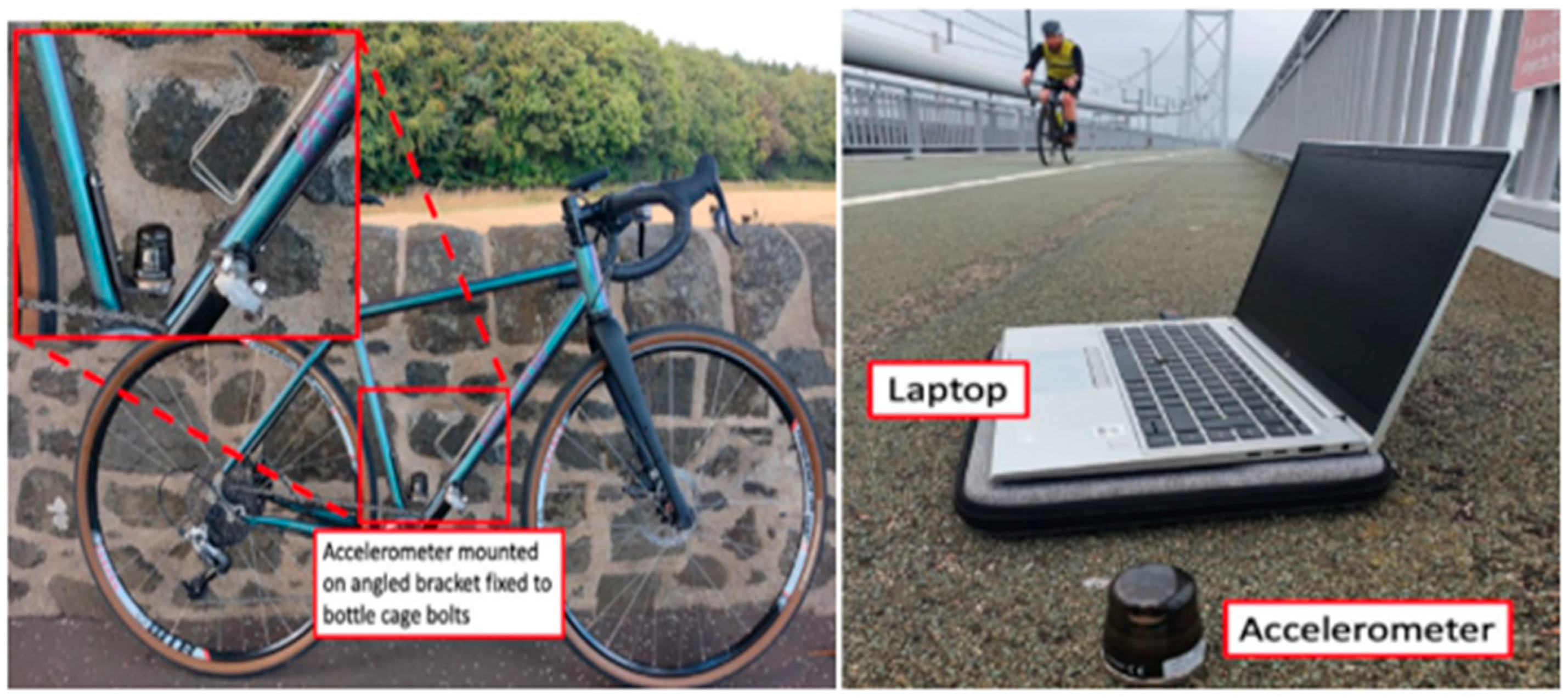 - May, R.; Chai, H.K.; Reynolds, T.; Lu, Y. Exploring the use of bicycles as exciters and sensor carriers for indirect bridge modal parameter estimation. In Proceedings of the 10th International Conference on Experimental Vibration Analysis for Civil Engineering Structures (EVACES 2023), Milan, Italy, 30 August–1 September 2023. [Google Scholar]