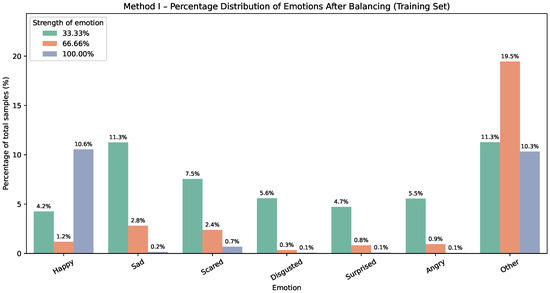 Method II—emotion distribution after balancing. Bars show percentages of the whole dataset; for each emotion, three bars indicate intensity levels (≈).