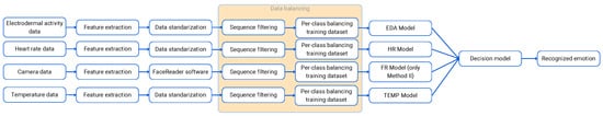 The overall pipeline, including feature extraction, unimodal modeling, and late fusion at decision level, is illustrated in Figure 5. The framework consists of four parallel streams for electrodermal activity, heart rate, temperature, and facial video, each undergoing feature extraction (Section 3.4.1), and data standardization and alignment (Section 3.4.2) are followed by data balancing, where per-class balancing was applied explicitly to the training dataset only (Section 3.4.3). Following preprocessing, unimodal models are trained for each modality (Section 5.1.1), and their outputs are integrated through a decision-level late fusion strategy (Section 5.1.2). Although FaceReader natively provides dominant-emotion labels, its output is additionally transformed for Method II to generate a proportional emotion-distribution vector rather than a single categorical label. This design leverages both physiological and behavioral signals to yield robust emotion recognition outcomes.