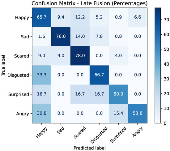 Overall, this study illustrates that even a relatively simple late fusion model can provide meaningful insights into the integration of synchronized physiological and behavioral signals for emotion recognition. While the model is not yet highly powerful, it serves as an initial step toward developing more adaptive and robust affective computing systems for children with ASD, laying the groundwork for future research on multimodal recognition under challenging conditions.
