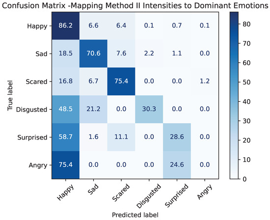 To allow a direct comparison between the regression-based Method II and the categorical Method I, the continuous emotion intensity outputs of the test dataset of Method II were converted into dominant-emotion labels by selecting, for each frame, the class with the highest predicted percentage. This procedure enables Method II to be evaluated using the same categorical metrics and confusion-matrix structure as Method I.
