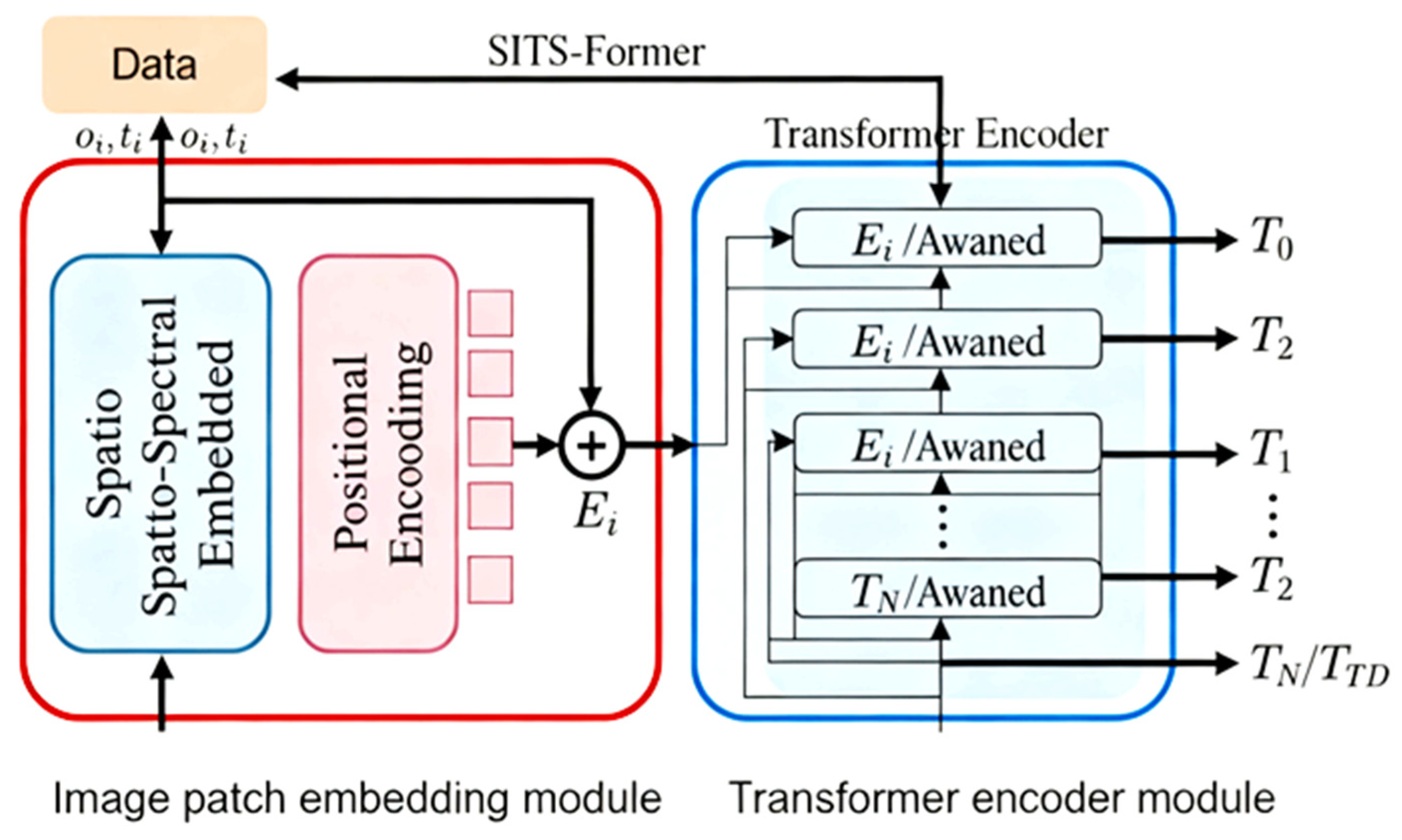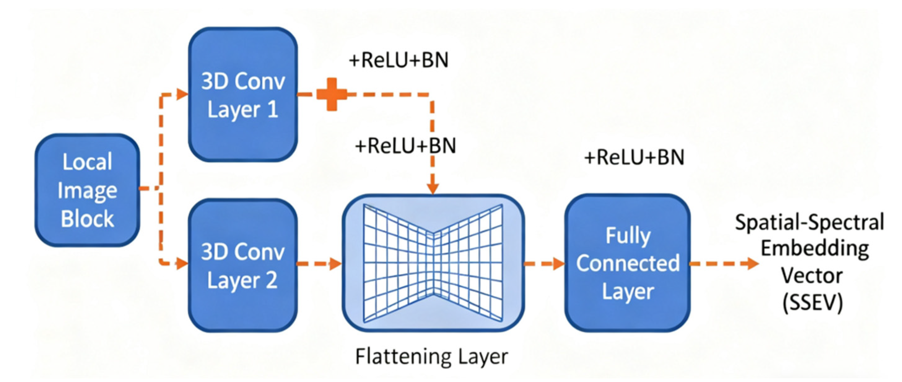 55]. These modules extract deep spatial, spectral, and temporal information from remote sensing time series data. The image block embedding module analyzes each local image block to create a spatial-spectral embedding vector (SSEV). This is accomplished through a lightweight network comprising two 3D convolutional layers, a flattening layer, and a fully connected layer (