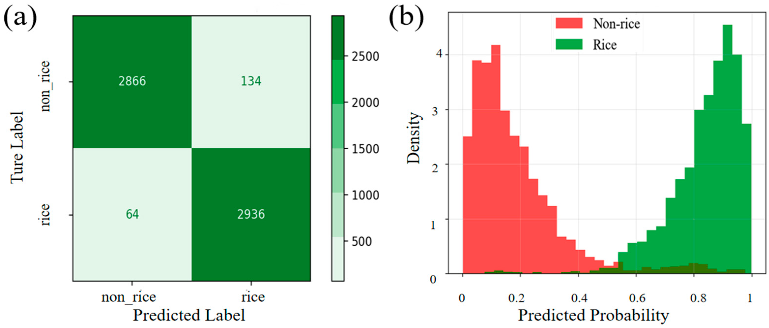 This study evaluated the performance of the proposed SITS-Former model in rice and non-rice classification using confusion matrices and prediction probability density plots (