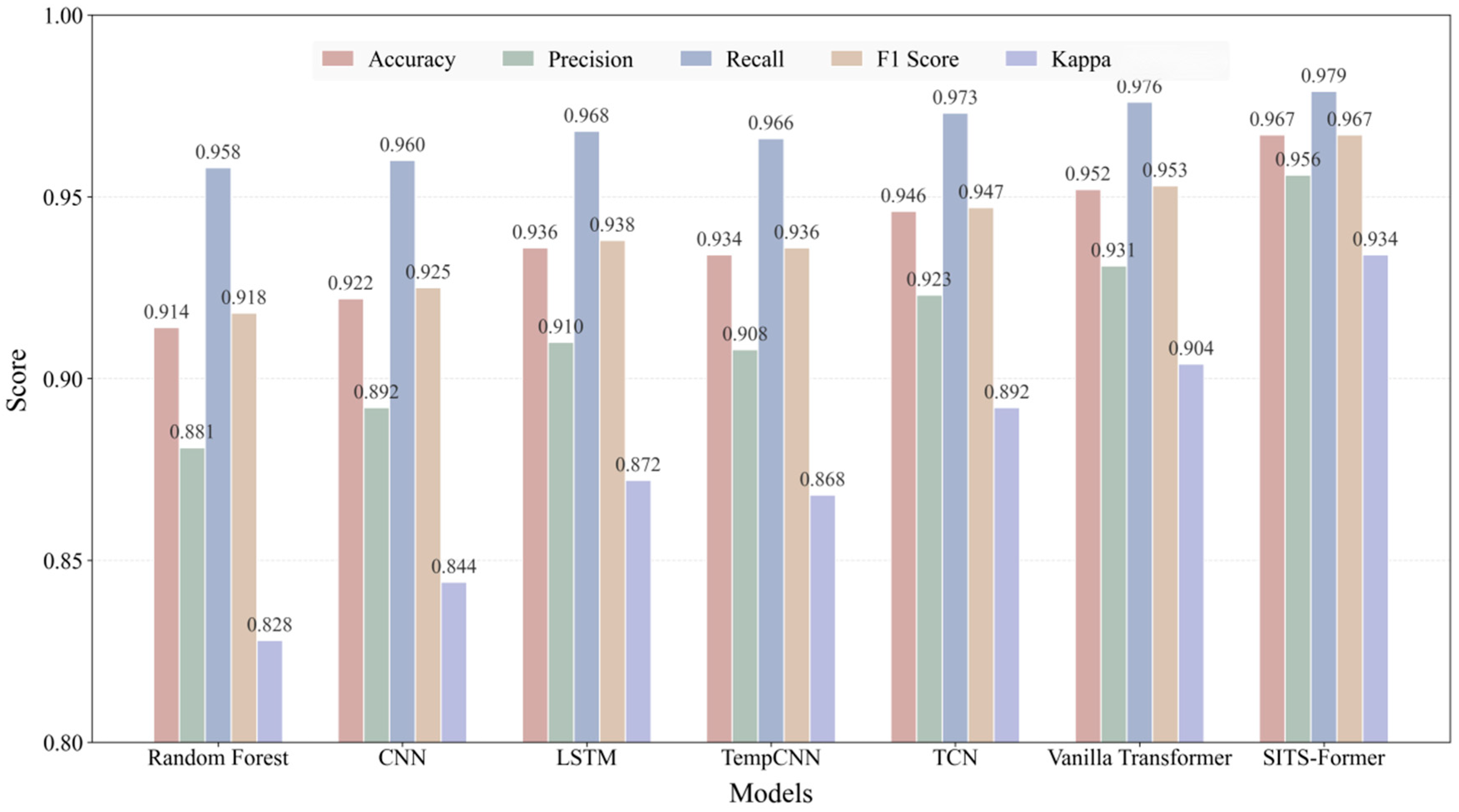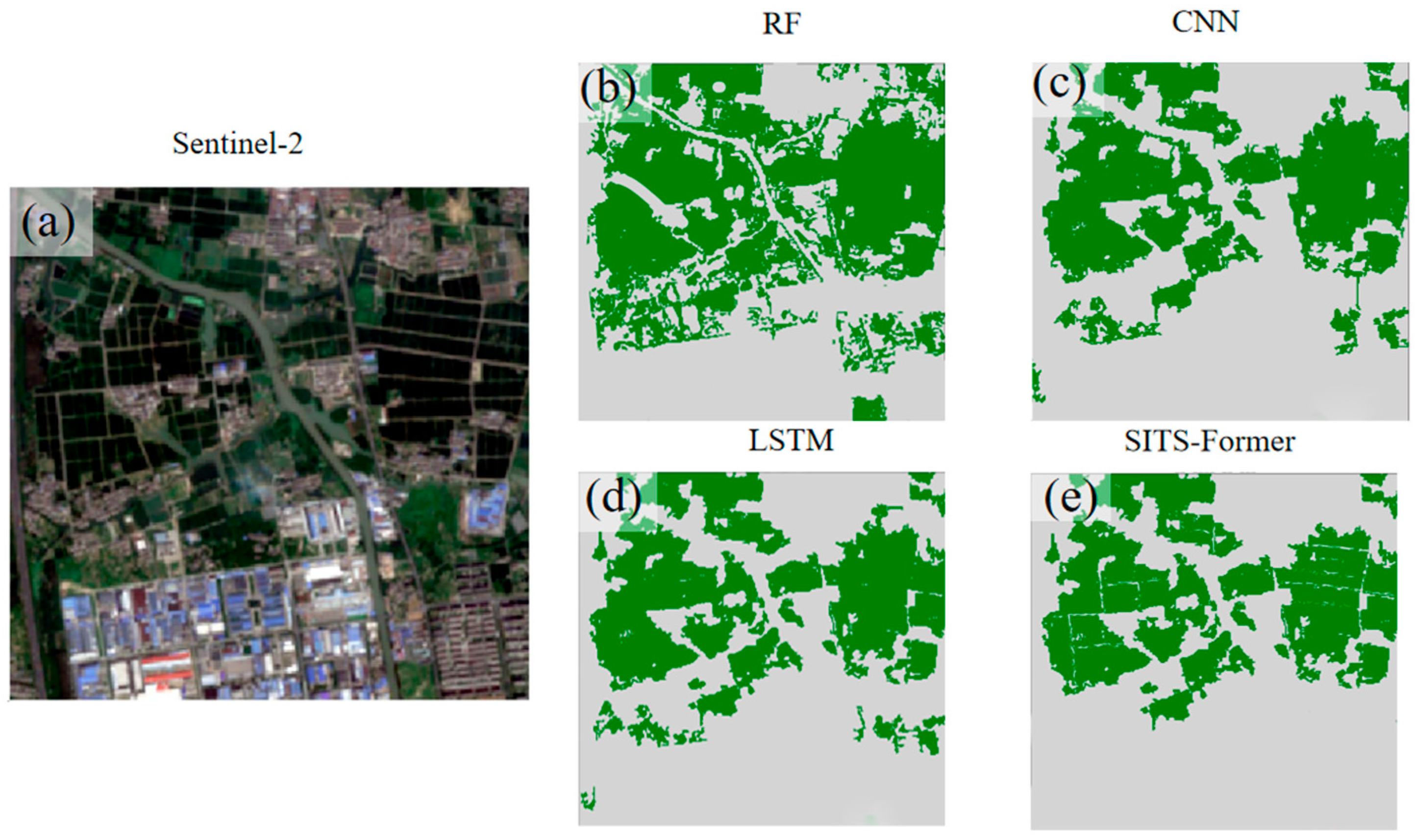 Figure 7. SITS-Former significantly outperforms the comparison baselines across all metrics, achieving an accuracy of 0.967. Notably, the model achieves a recall of 0.979, demonstrating its ability to effectively identify the vast majority of rice field areas while minimizing missed detections. This outstanding performance primarily stems from the model’s innovative spatio-temporal attention fusion mechanism. This design enables adaptive capture of critical spatio-temporal features throughout the rice growth cycle, demonstrating distinct advantages in handling long sequences, complex dynamics, and spatial dependencies. These experimental results fully validate SITS-Former’s technological advancement as a next-generation remote sensing time series analysis tool. Its exceptional performance provides a reliable technical foundation for crop monitoring in precision agriculture.
