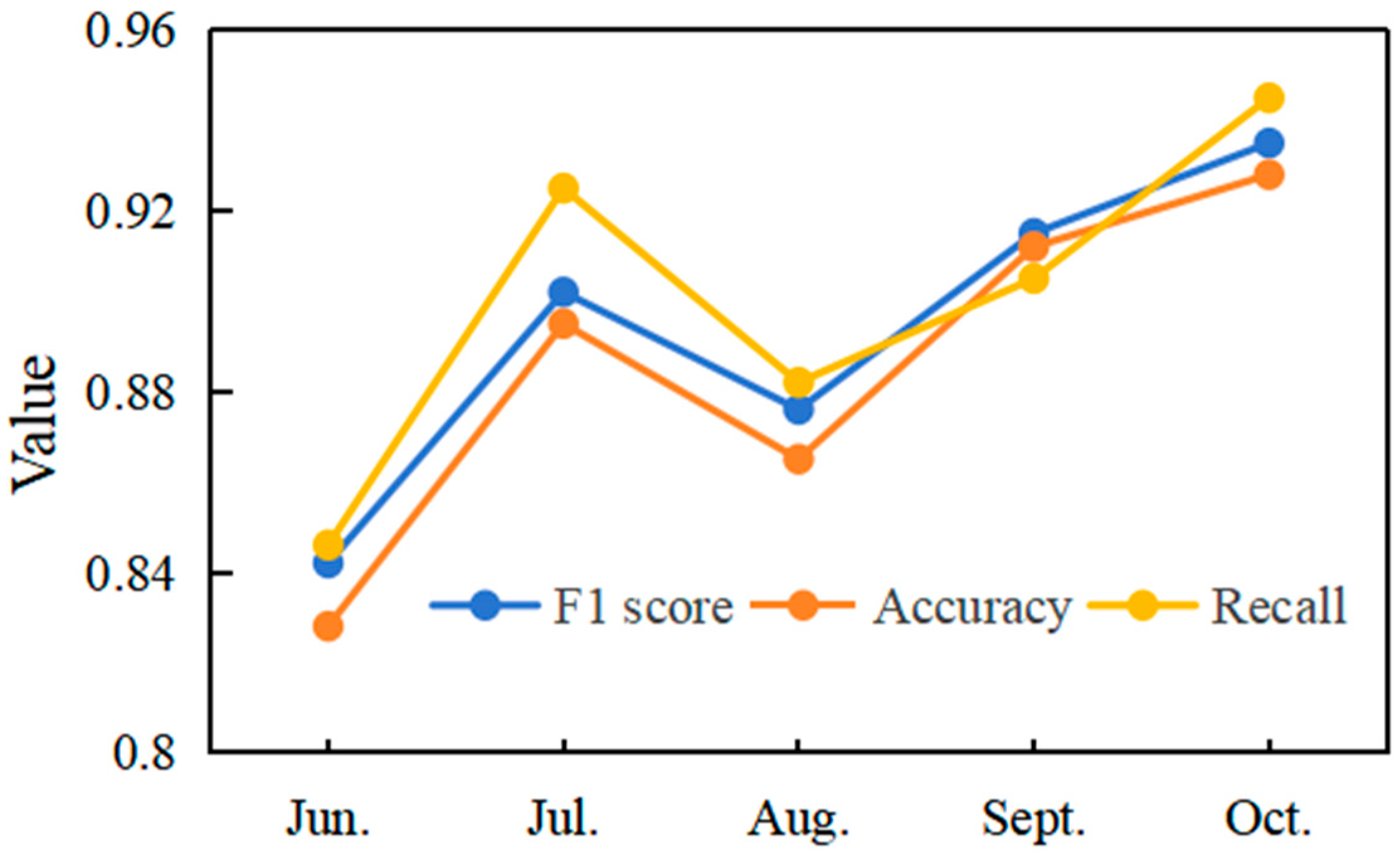 By August, the rainy season brings more cloud cover and atmospheric scattering, which degrade the radiometric accuracy and spatial resolution of optical remote sensing data. Spectral information that was clearly discernible in some rice fields becomes obscured, increasing the difficulty of spectral unmixing and rice identification. At this point, using single-stage data for rice identification drops the accuracy to 0.875, lower than the accuracy in July, September, and October. Furthermore, even when clear data is available, the spectral reflectance in August, representing peak growth, might be affected by phenological delays caused by excessive rainfall. Such delays can alter the typical curve shape of vegetation indices, for example, shifting the peak reflectance or slowing down the senescence phase. This deviation from the expected spectral signature further complicates single-stage analysis, as the observed spectral information might not accurately reflect the “typical” rice spectrum for that month.