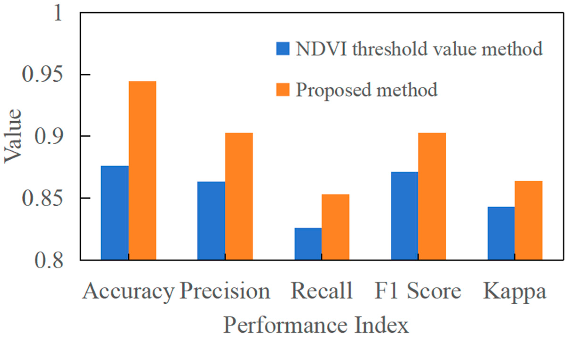We also compared results with those from using only NDVI thresholds. The specific classification results and accuracy numbers are shown in
