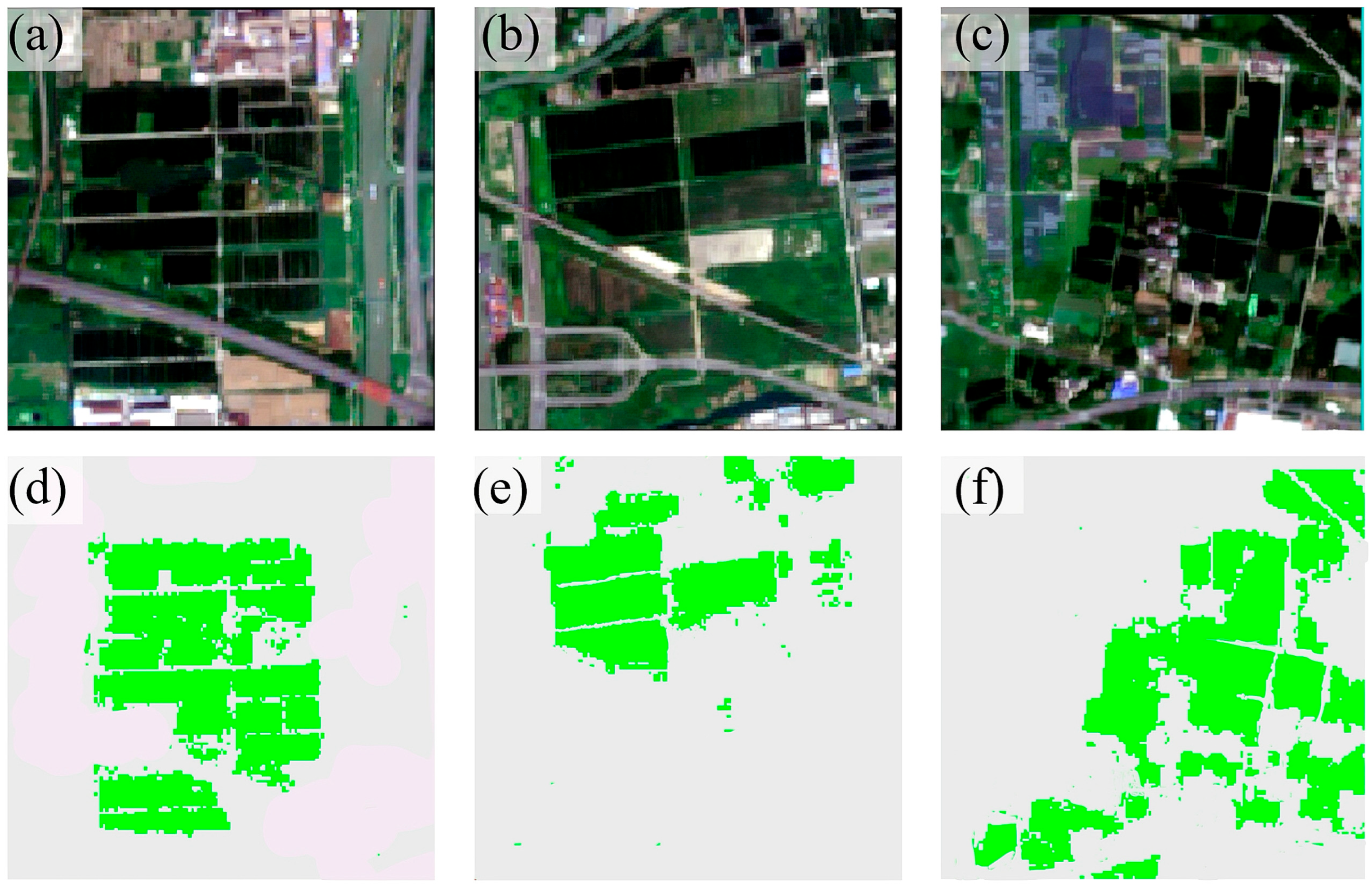 To better illustrate the model’s rice classification ability, we selected specific areas within Wuxi City and cropped them to 270 × 270 pixels, resulting in 72,900 sample points. Then, we used four different methods to identify and extract the selected area (