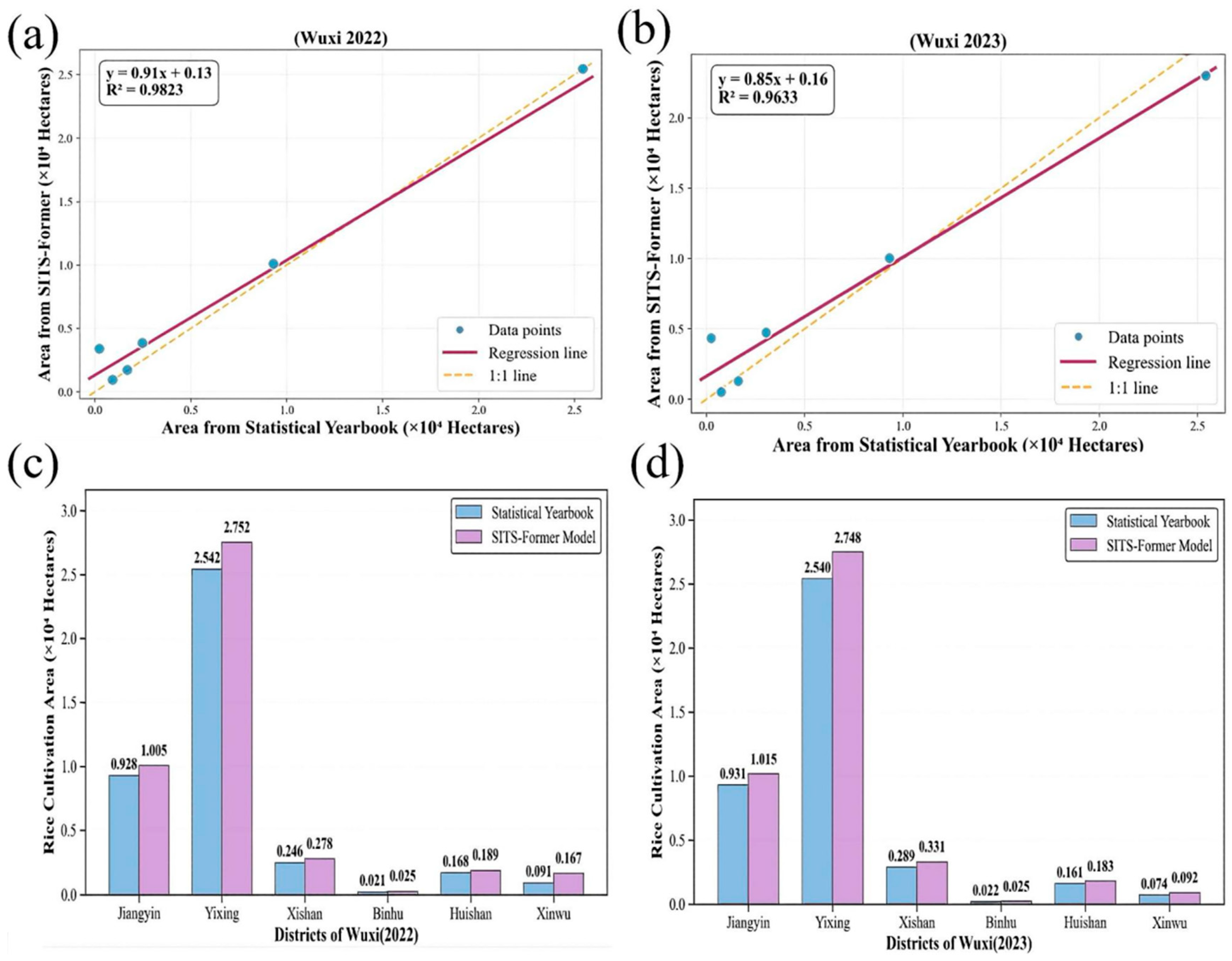 The SITS-Former model proposed in this study demonstrates excellent performance in identifying fragmented paddy fields in the Wuxi area. To systematically evaluate its classification accuracy and generalization capability, we conducted a multi-dimensional comparison between its outputs and official statistical yearbook data (