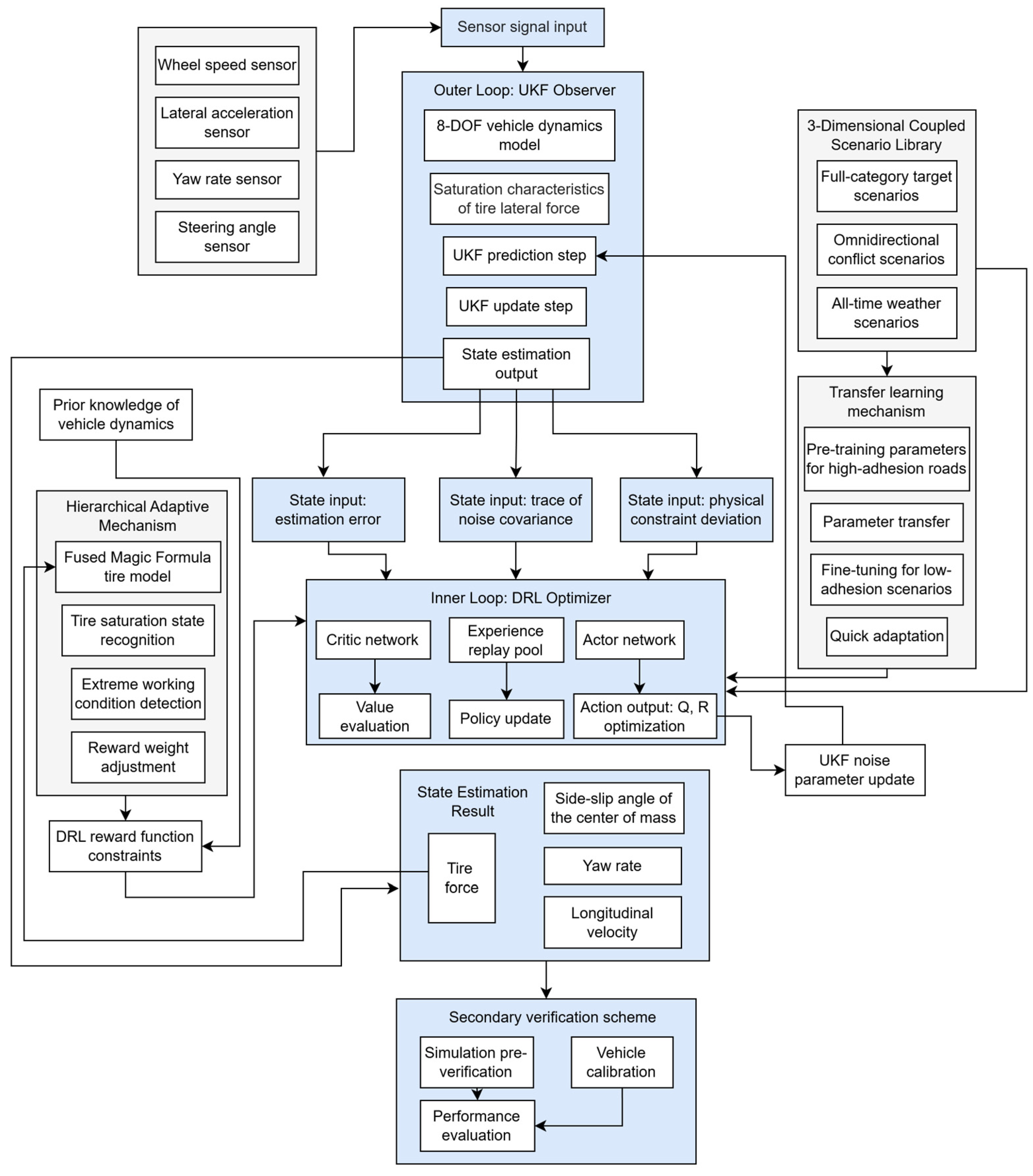 | Fusion Framework Trend | UKF + DRL (Proposed Scheme) | Optimizes noise parameters via DRL; physical model constrains estimation boundaries; and achieves high accuracy and robustness across all conditions | Still in the research stage; difficult to balance real-time performance and generalization |