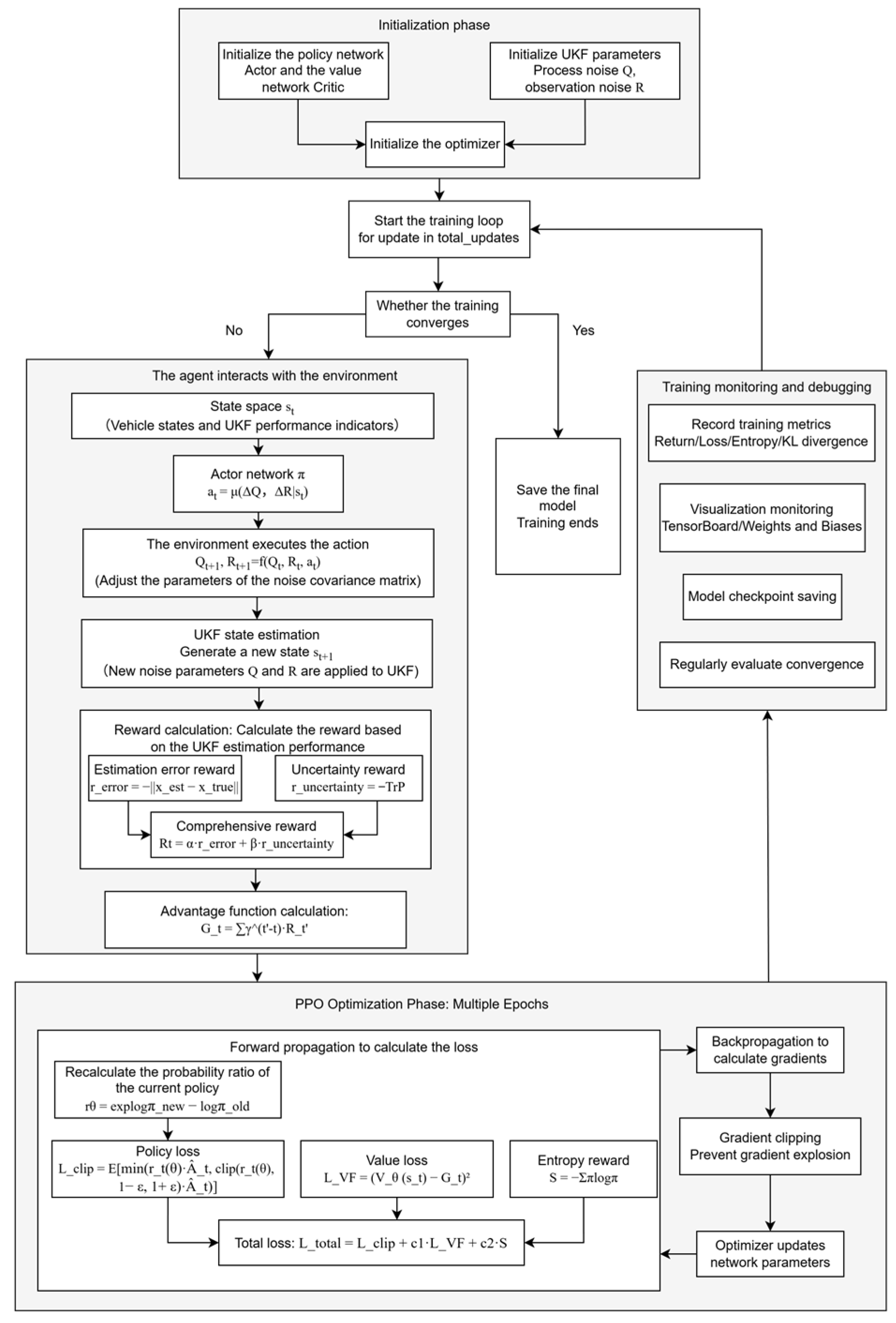 - A DRL-based noise adaptive mechanism adapted to high-dimensional UKF is designed. The state space and action space are expanded, the tire force saturation is introduced as the basis for operating condition division, the structure of the reward function is optimized, and the PPO algorithm is used to train the policy network. This realizes the dynamic adjustment of the process noise covariance Q and the observation noise covariance R, and improves the adaptive capability of the filter.